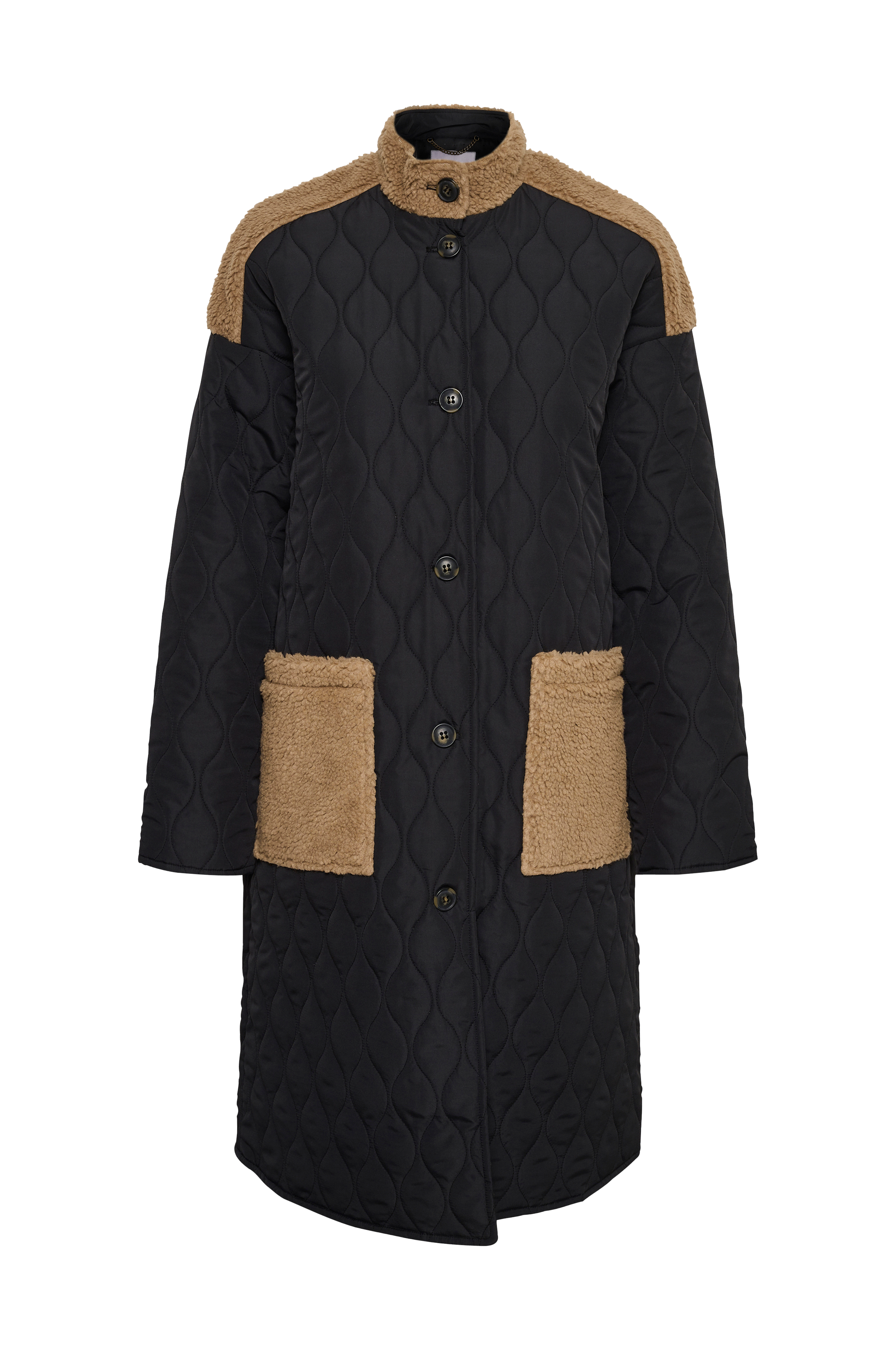 En quiltet og let vatteret frakke med plys på skuldrene, kraven og overdelen på ryggen. Lukkes med knapper. To påsyede lommer i plys. Længde ca. 103 cm i str. 36.