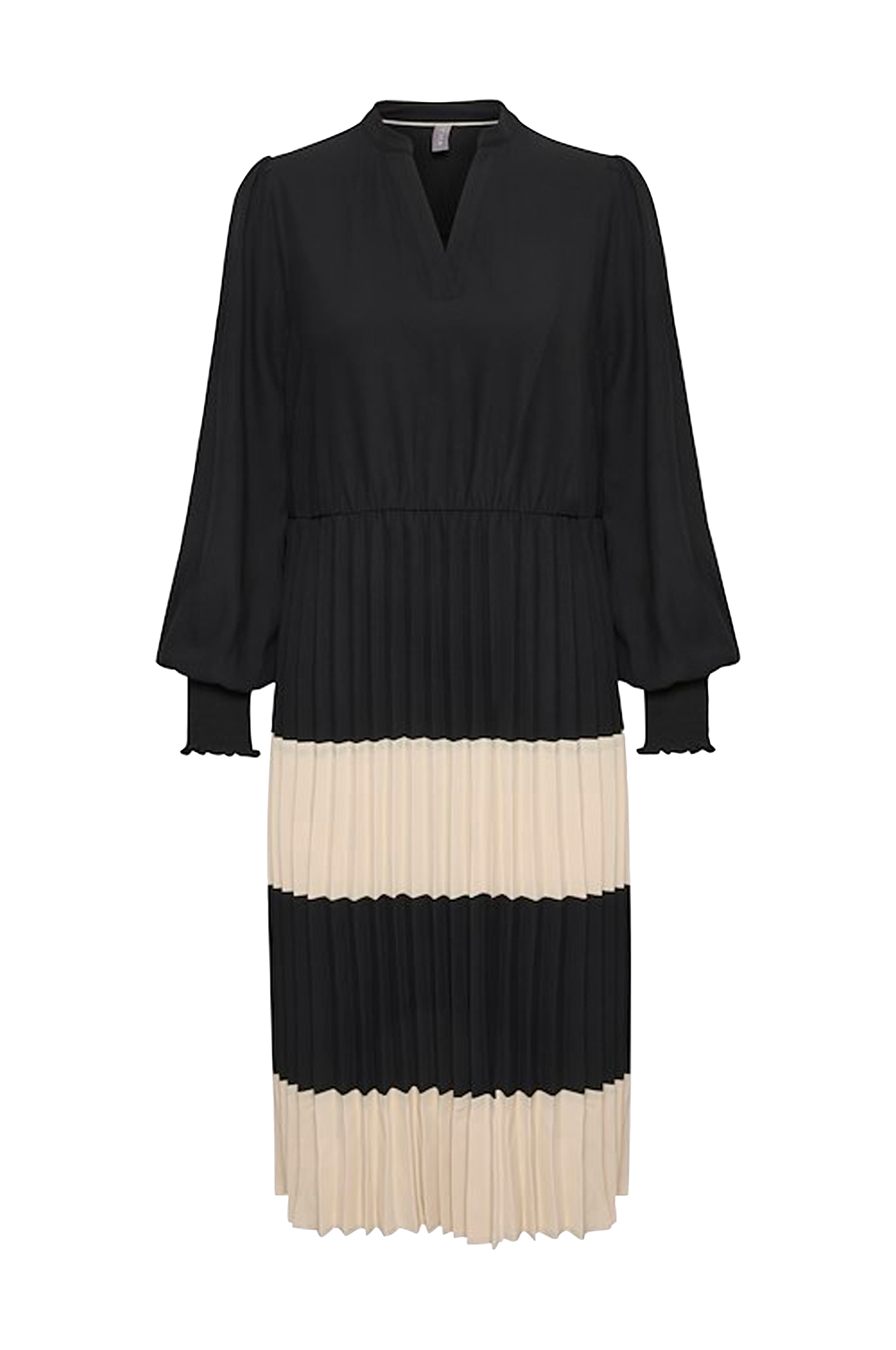 Midikjole med plisseret underdel. Lange ærmer med smock i ærmekanten. Elastisk talje. Længde ca. 114 cm i str. S.