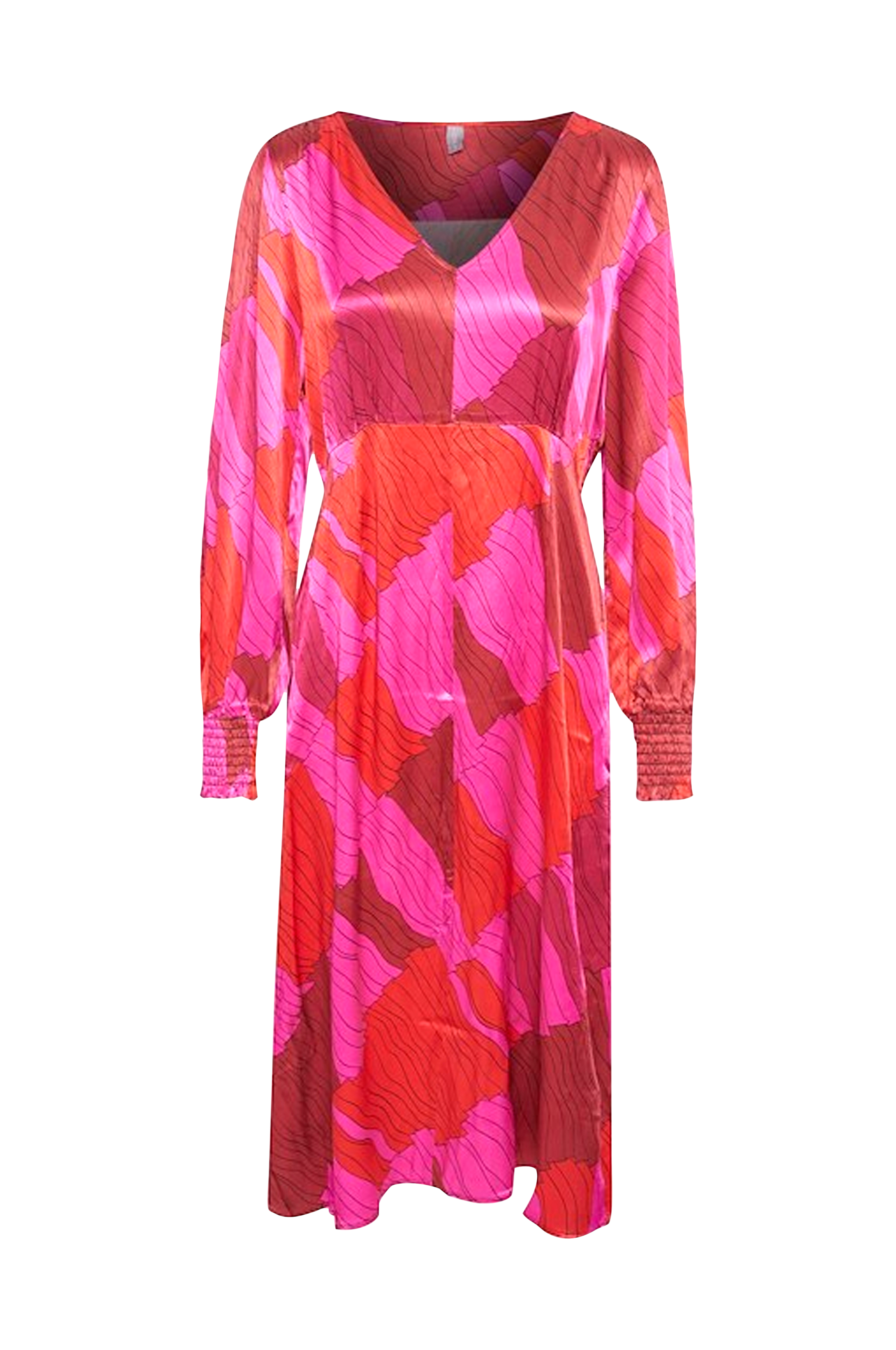 • Mønstret midikjole i satin• V-udskæring• Lange ærmer med smock ved manchetterne• Længde: 113 cm i størrelse S