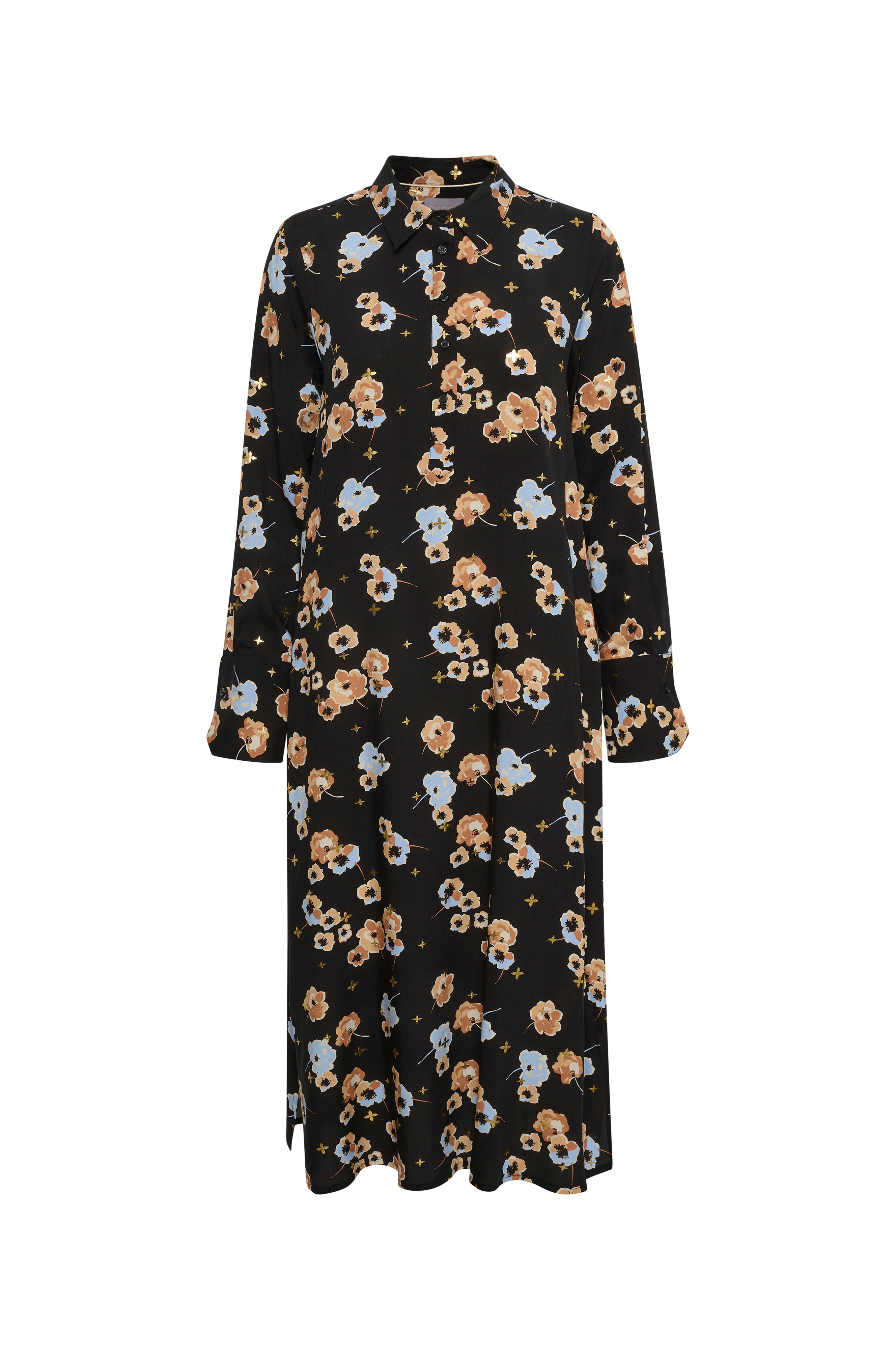 Ankellang, let A-formet model med lommer i siderne og knapper foroven foran. Lange ærmer med bred manchet. Kort slids i siderne. Længde ca. 122 cm i str. S.