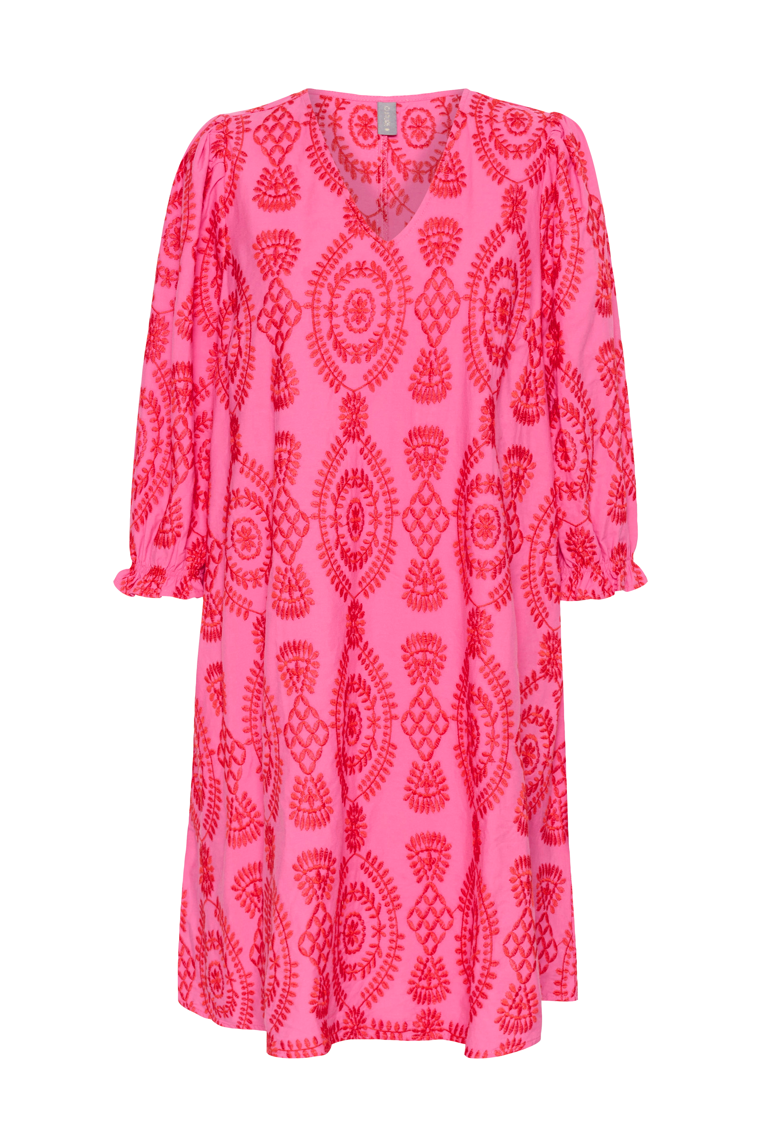 • V-udskæring• A-linje design• 3/4 lange ballonærmer• Broderet mønster• Længde: 96 cm i størrelse S