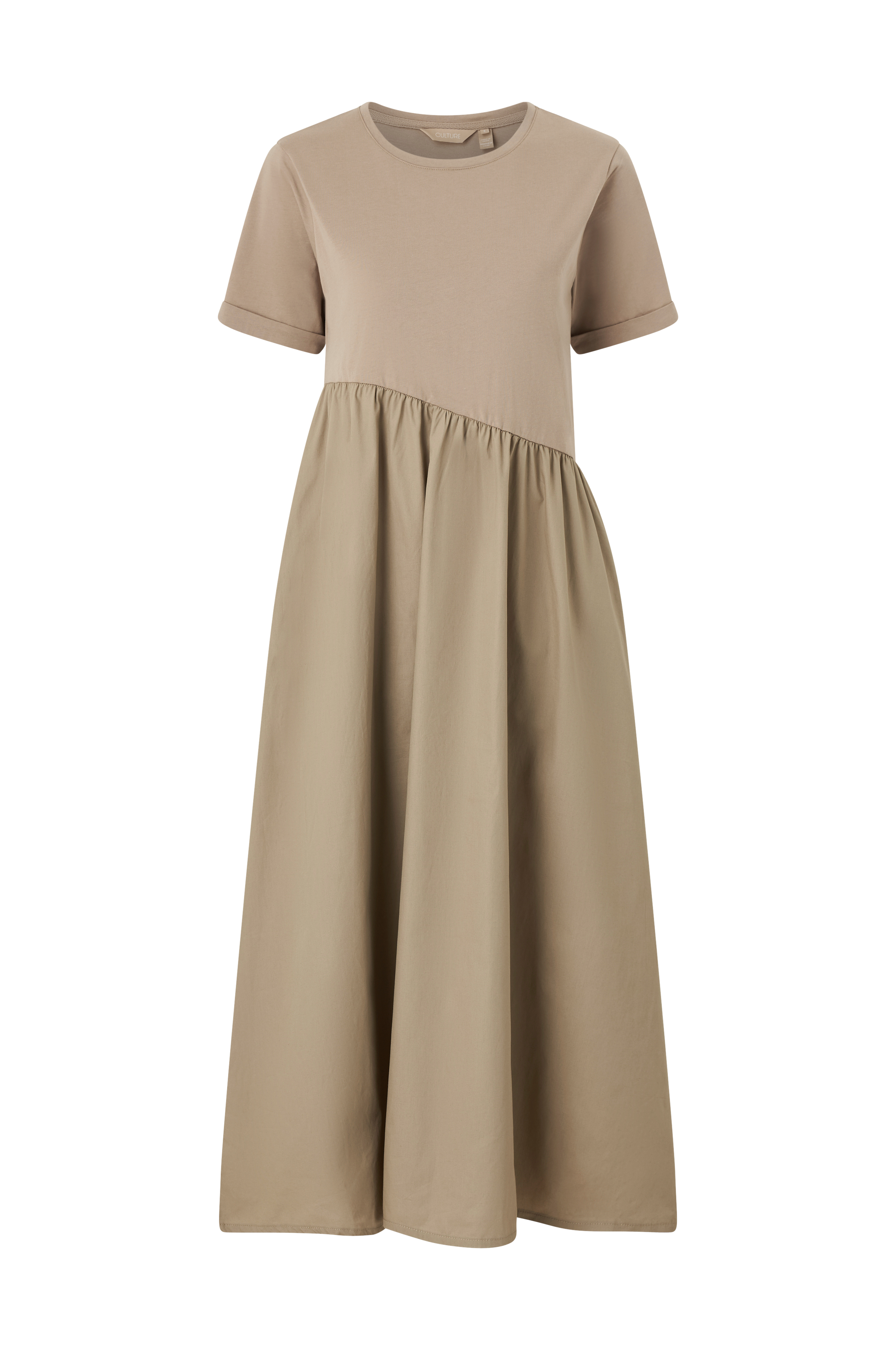 • Lang model med svaj• Øvre del i jersey med rund hals og kort ærme med en oprullet• Rynket, diagonal talje• Sidelommer• Længde: 131 cm i størrelse S
