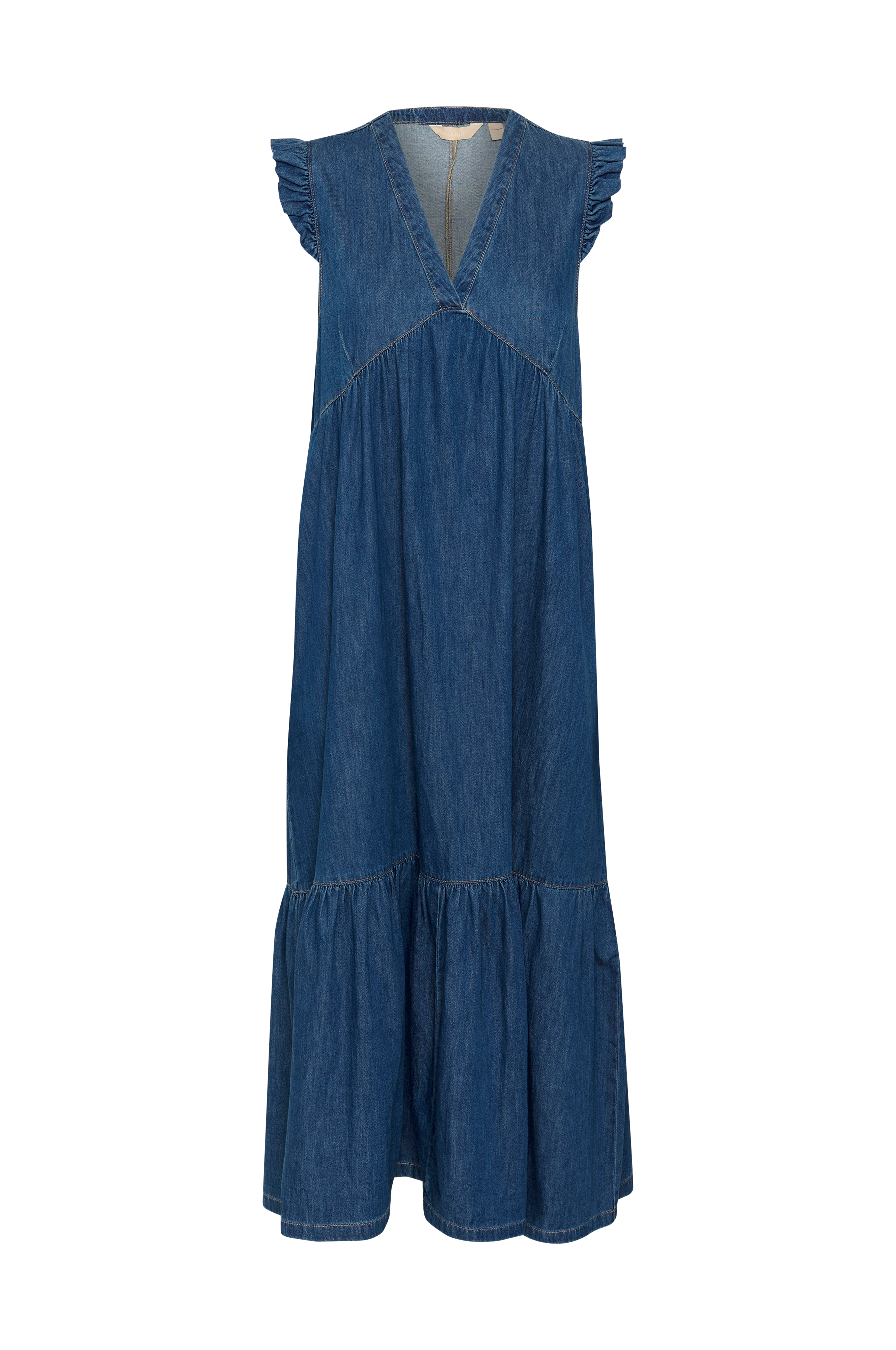 • Kjole i bomuldsdenim• V-udskæring• Ærmeløst design med flæsekant hele vejen rundt• Dekorativ søm under brystet og langs ryggen• Bred, påsyet flæsekant nederst• Sidelommer• Afslappet pasform• Længde: 132 cm i størrelse S