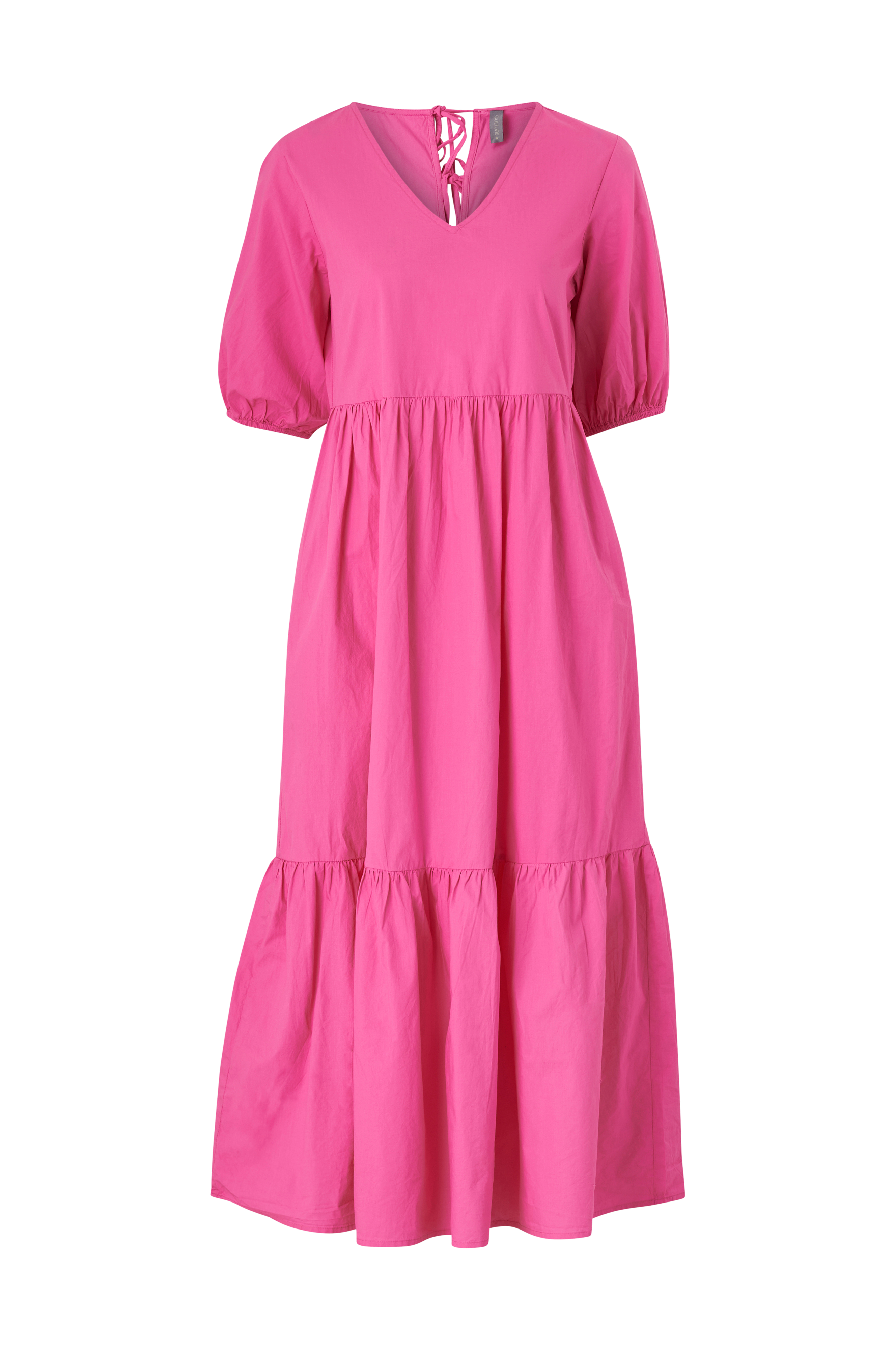 • Lang model med svaj med rynket talje• V-formet halsudskæring med åben ryg og fire bindebånd• Ærme med elastik ved manchetterne• Bred volant ved nederste kant• Længde: 129 cm i størrelse S