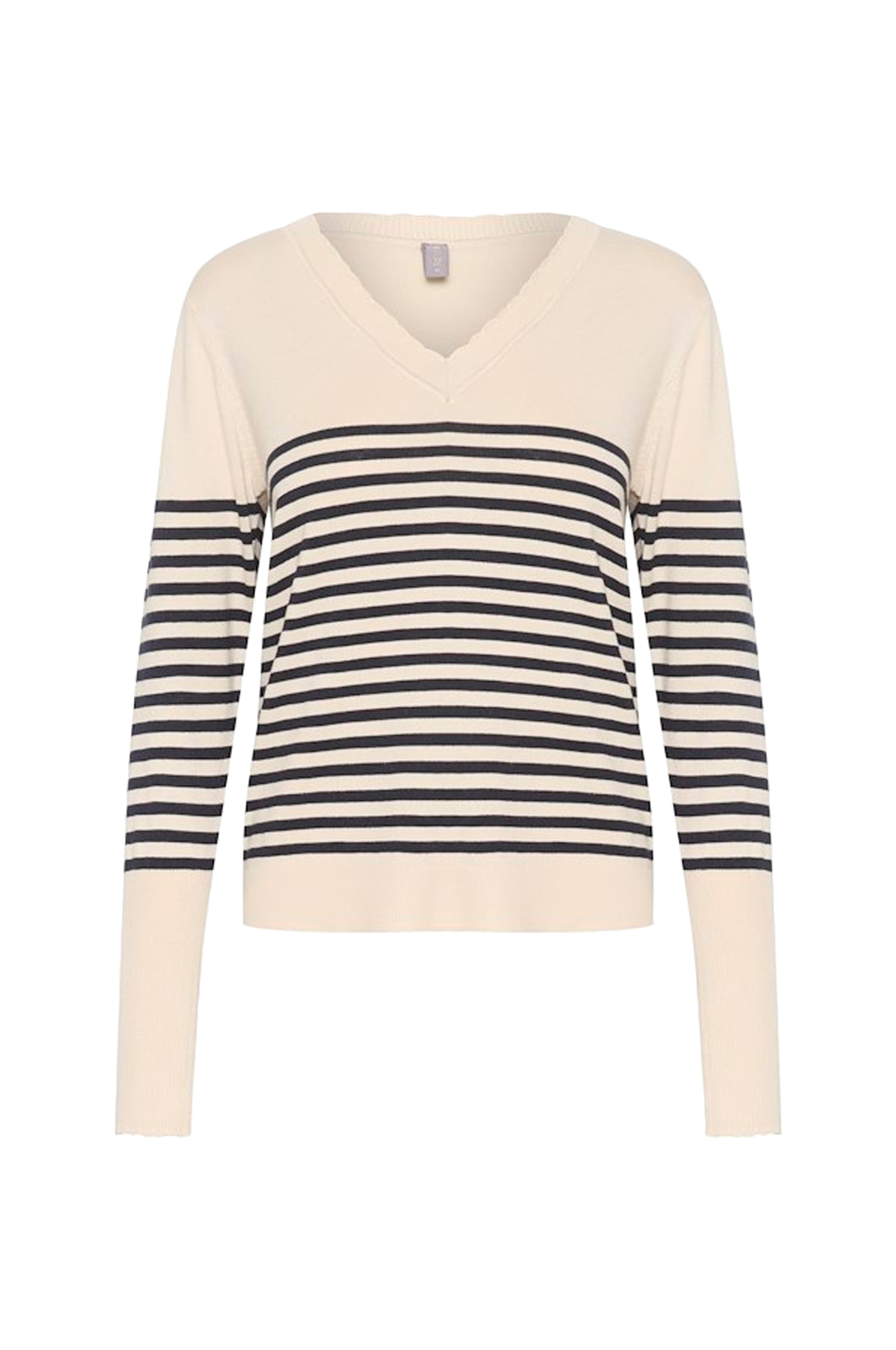 • Trøje i blød viskoseblanding• Bølget ribkant i halsen• V-udskæring• Lang manchet ved manchetterne