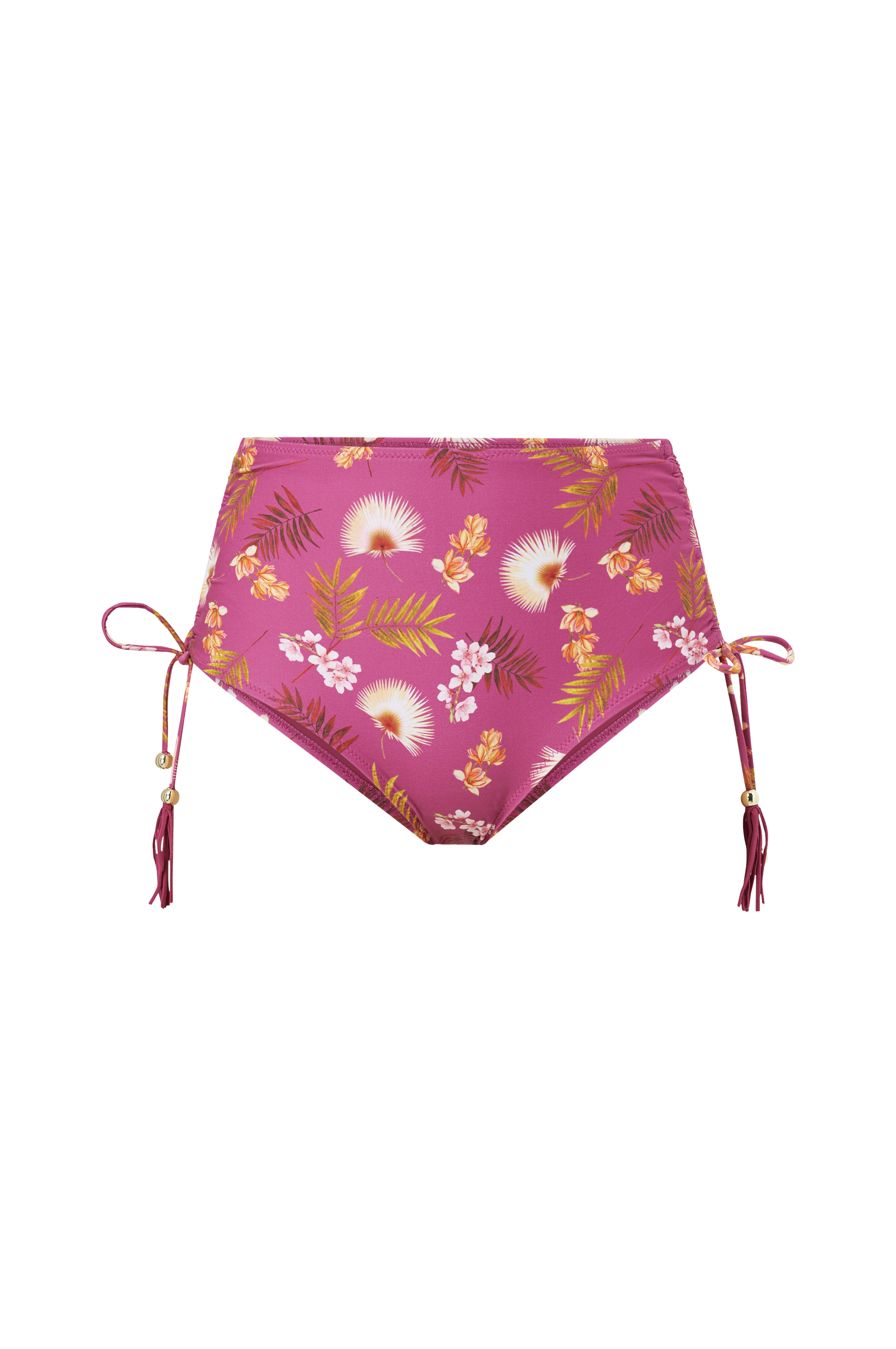Bikinitrusse i høj model med brede sider som justeres med løbegang med kvaste i siderne. Helforede.