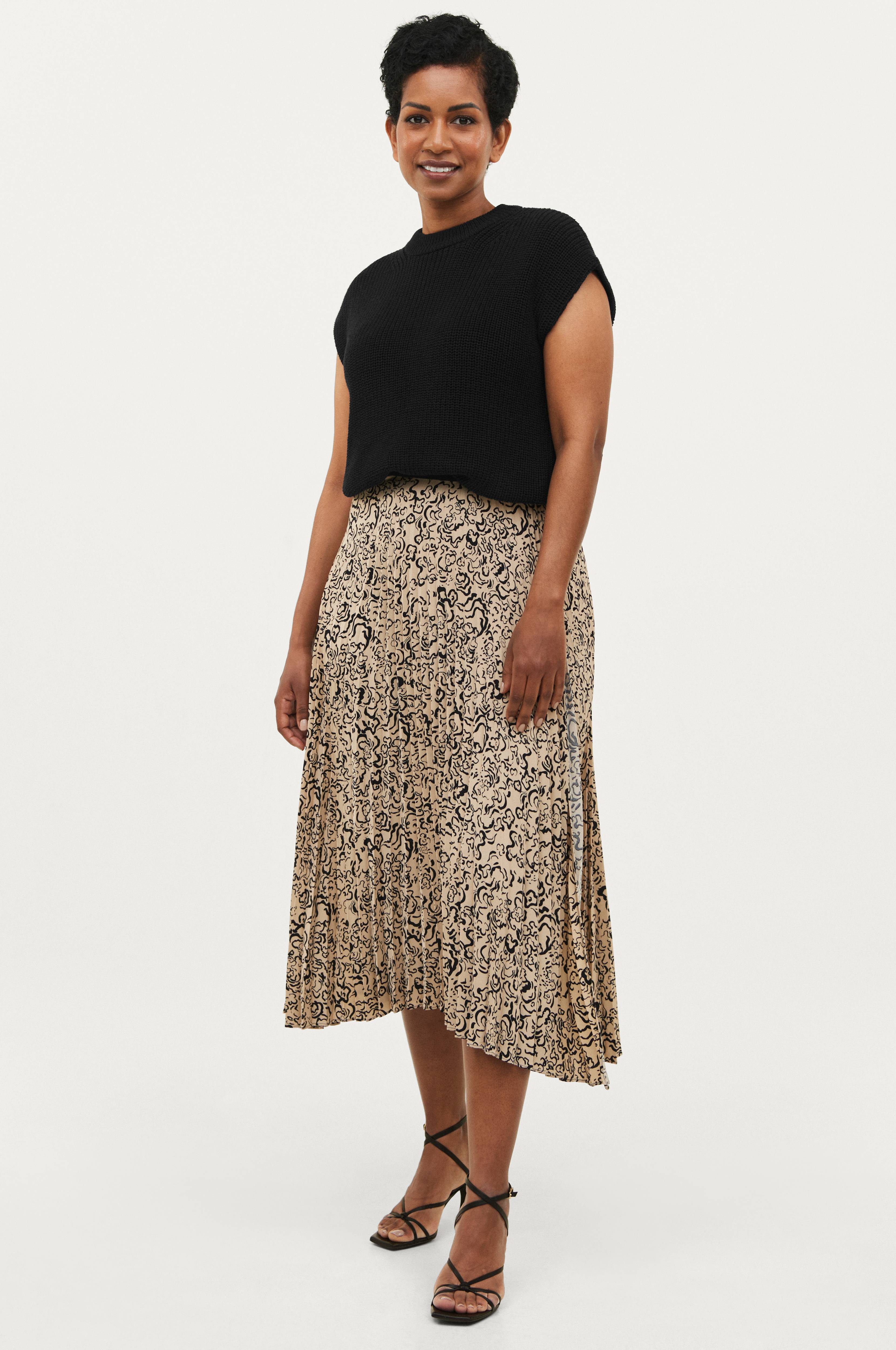 Plisseret nederdel i vævet kvalitet med mønster. Slå-om-design med hægte og malle i taljens ene side. Bred elastik i taljen. Længde ca. 80 cm i str. 36.