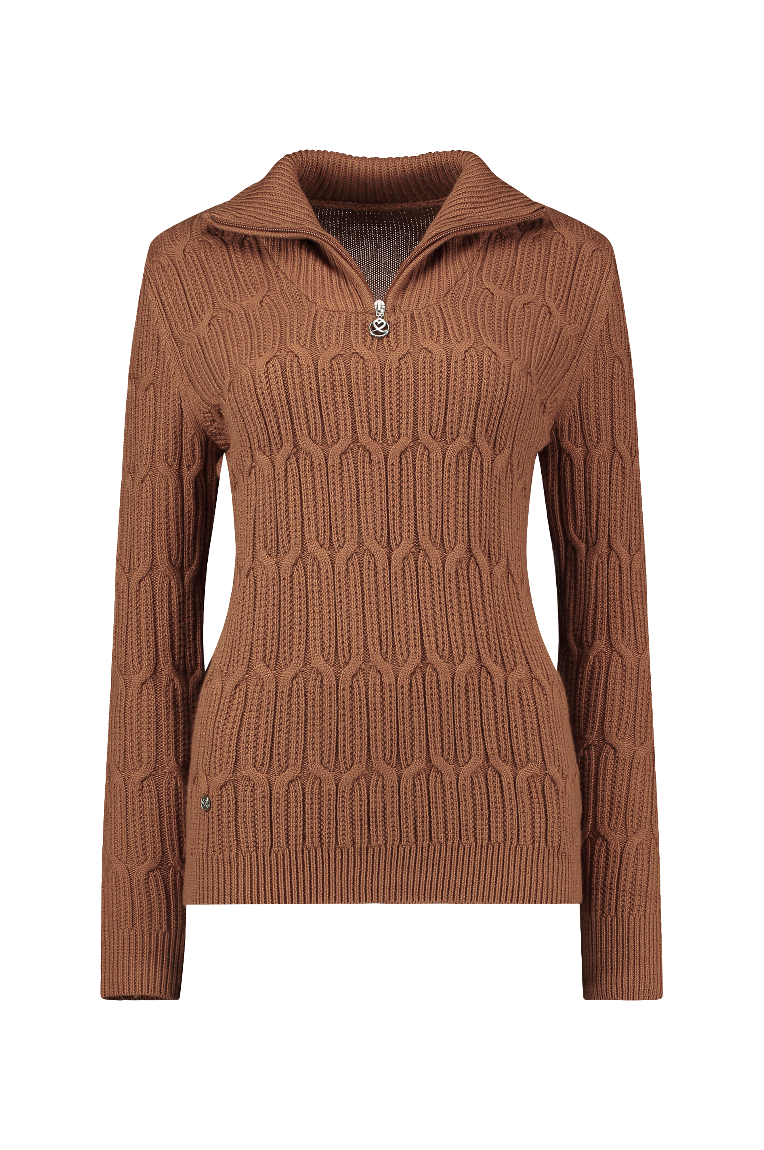 • Strikket trøje i uldmiks• Kabelstrikket forside• Glatstrikket bagside• Opretstående krave med lynlås• Figursyet pasform