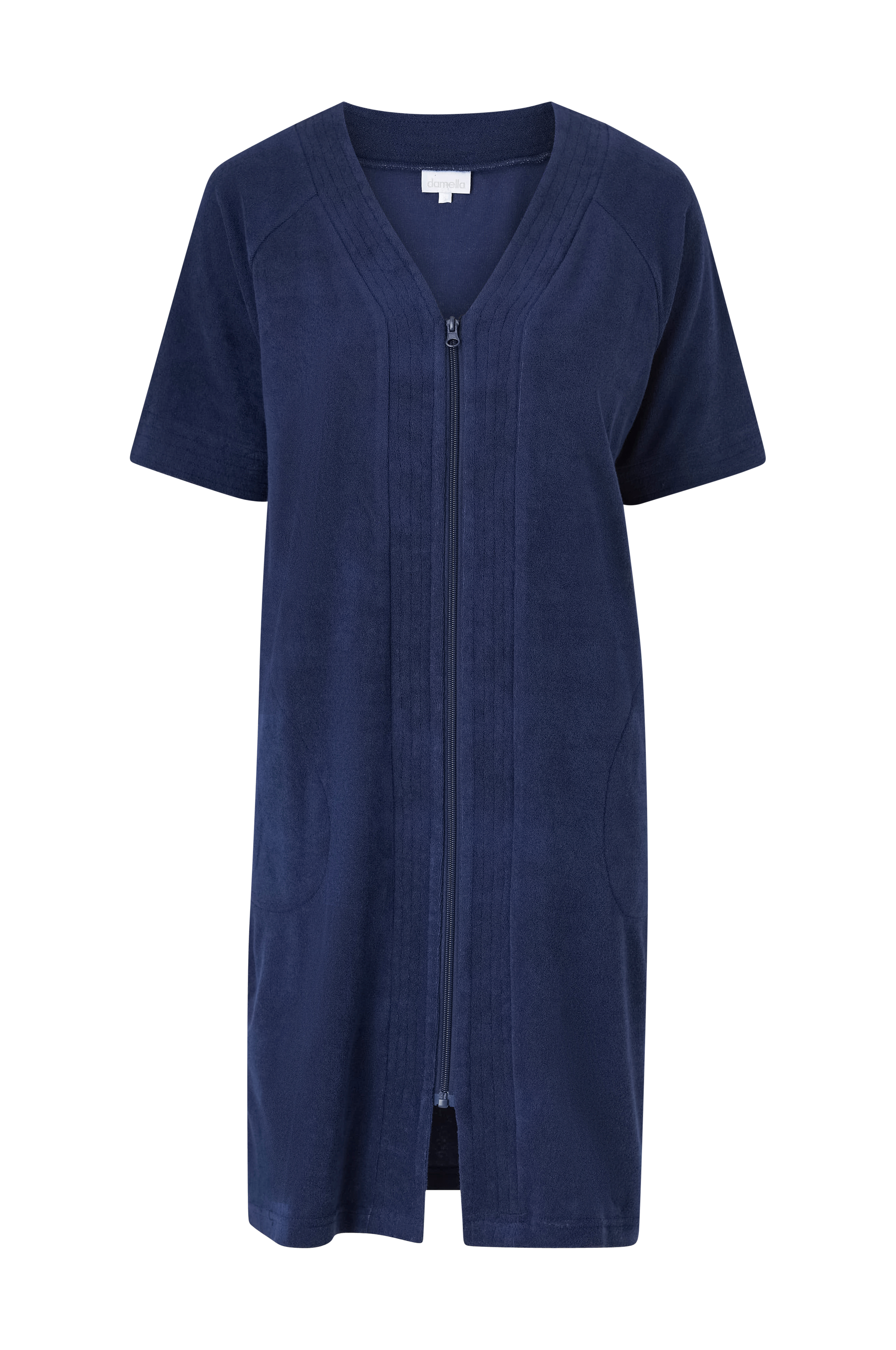 • Lige model i frotté• V-formet halsudskæring• Lang lynlås foran• Kort ærme• Sidelommer
