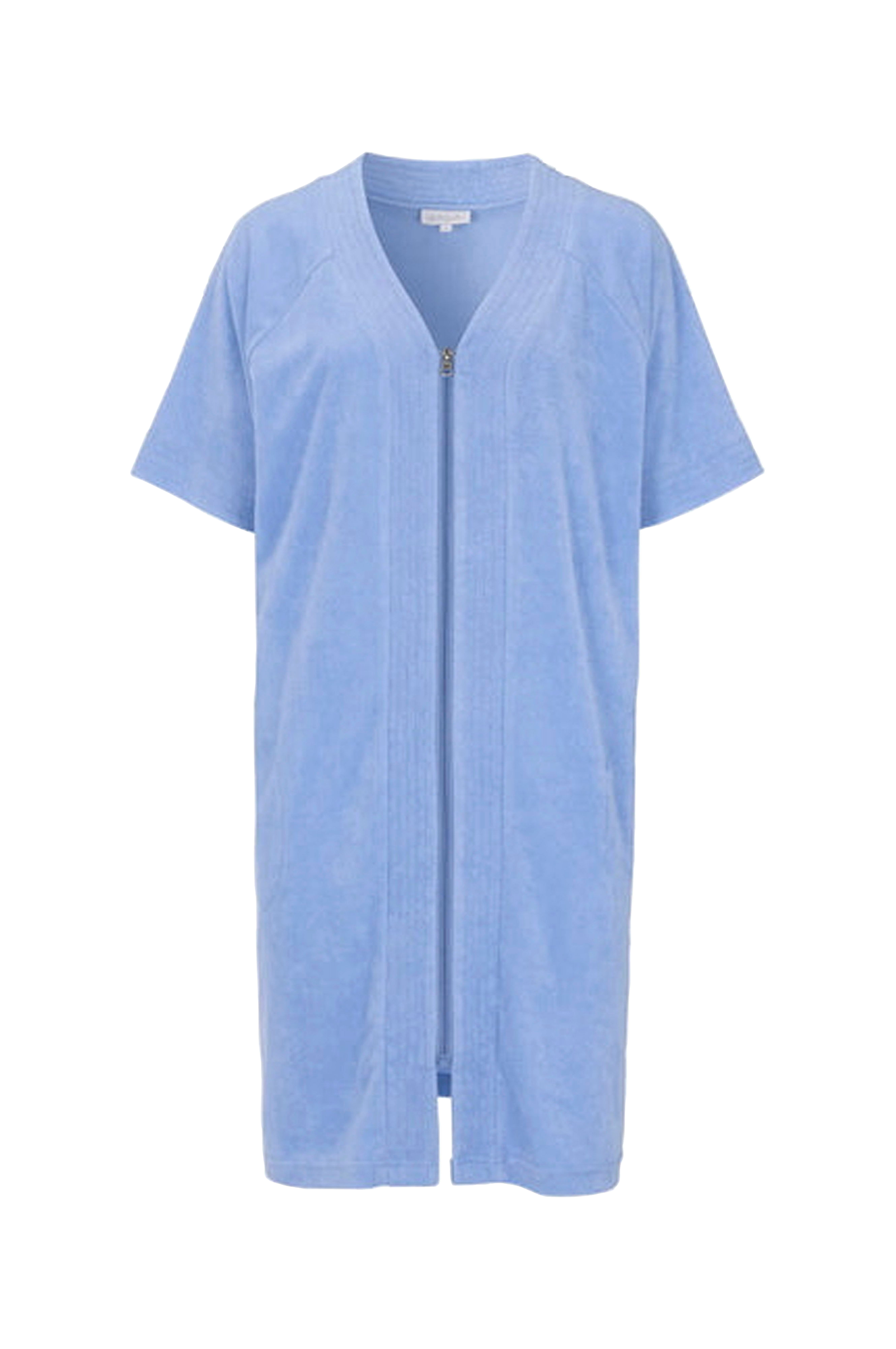 • Lige model i frotté• V-formet halsudskæring• Lang lynlås foran• Kort ærme• Sidelommer