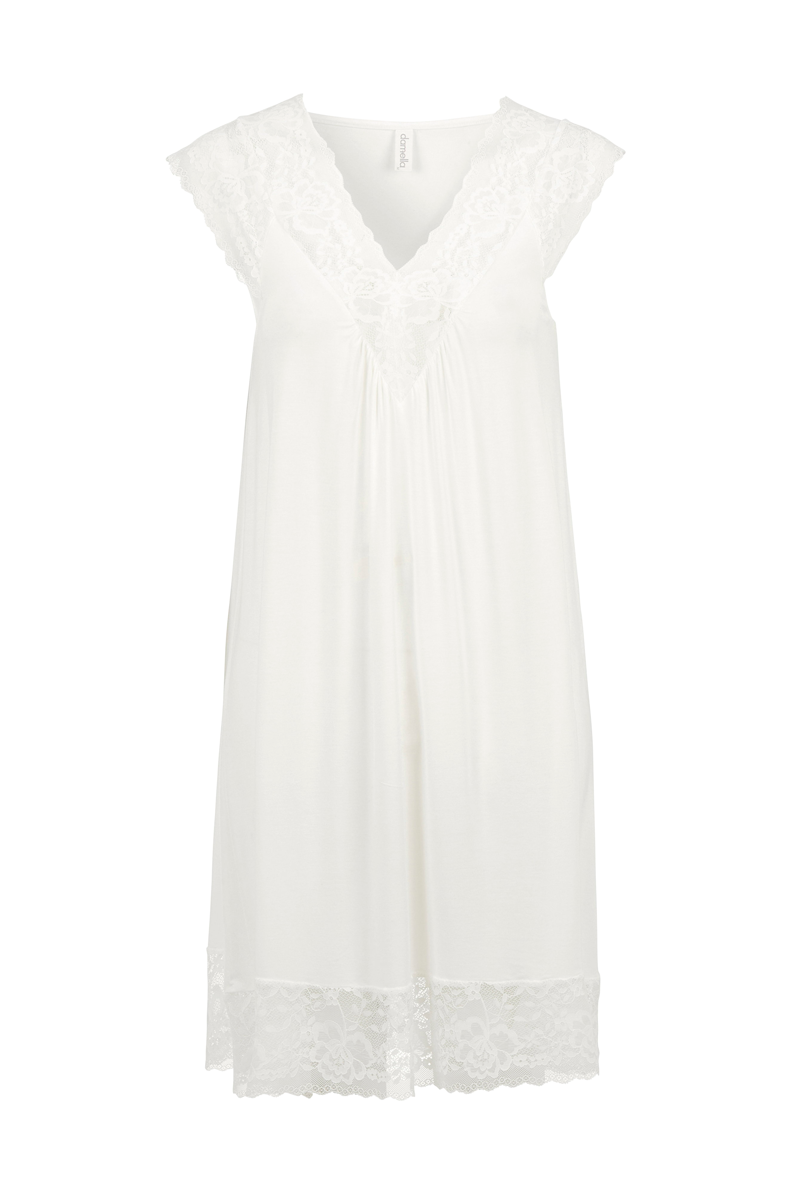 Ærmeløs natkjole med en elegant V-formet blondedetalje ved halsen og blonder rundt om forneden. Viskosestoffet giver en glat pasform, der rammer den perfekte balance mellem elegance og komfort.
