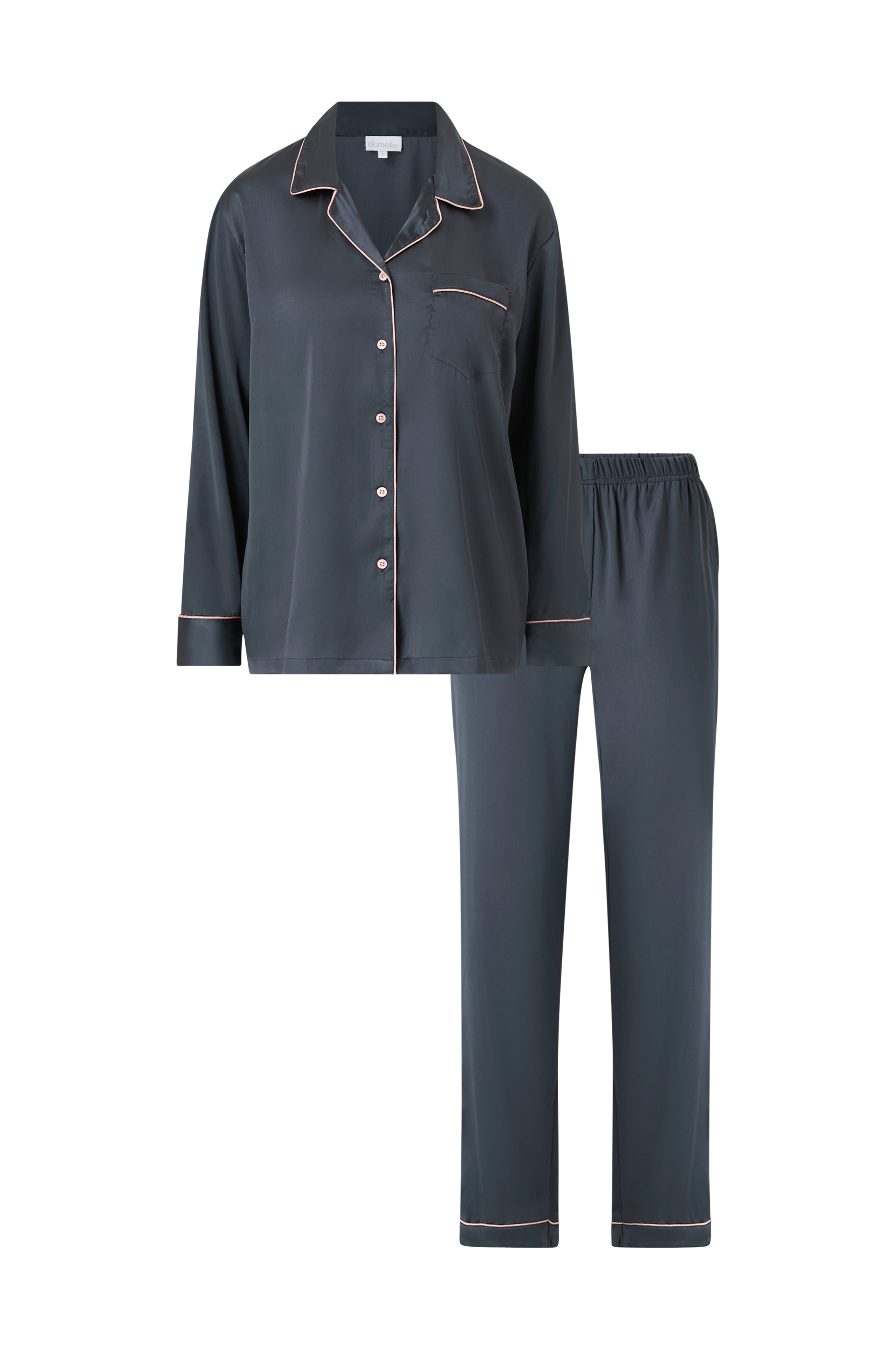 • Sæt i satin med matchende paspoleringer• Jakke med krave og revers• Knapper foran• Brystlomme• Bukser med elastisk linning og lige ben• Sidelommer