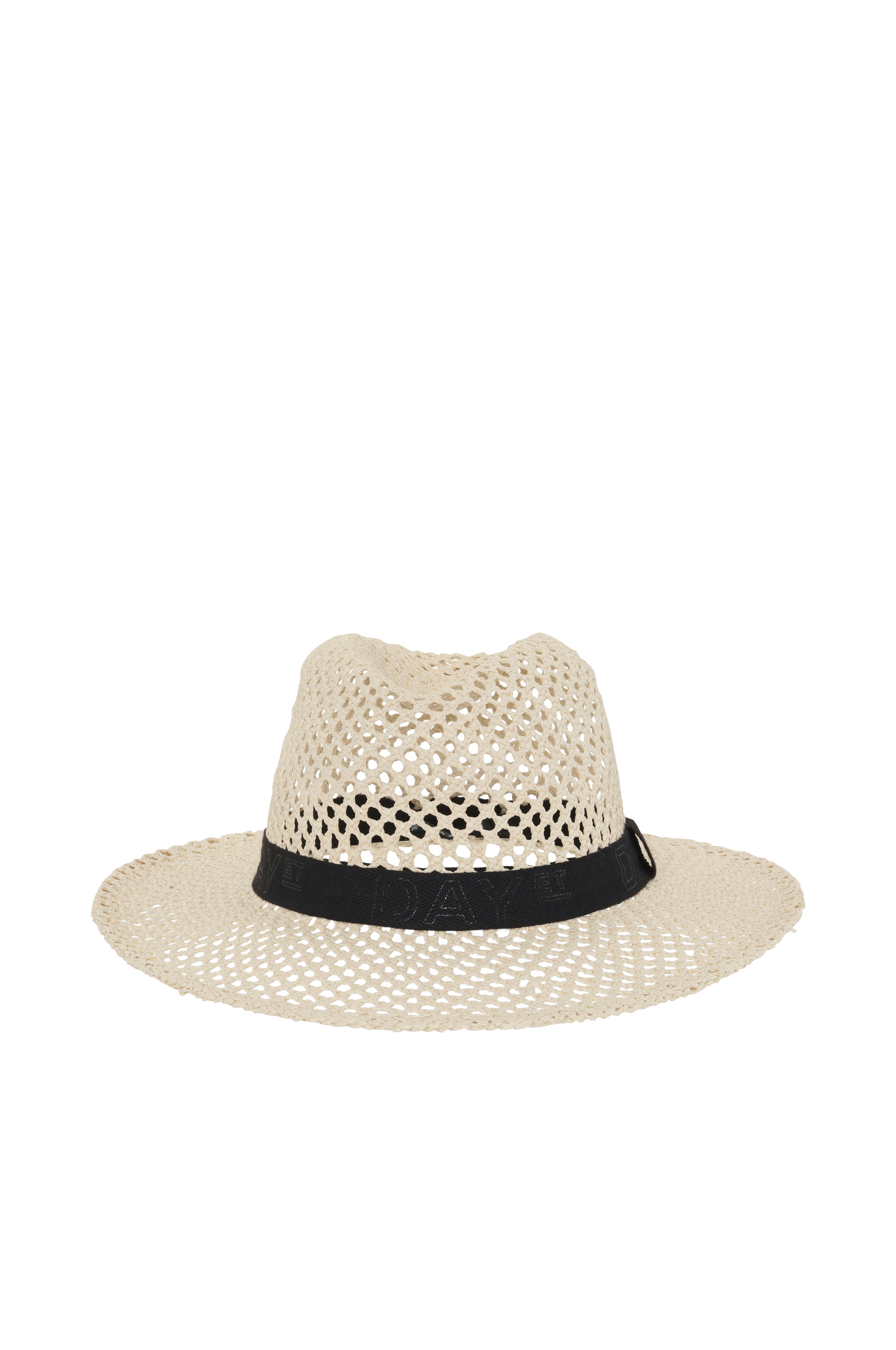 Hat af papirstrå med tekstilbånd rundt om. Skyggens bredde ca. 8 cm.