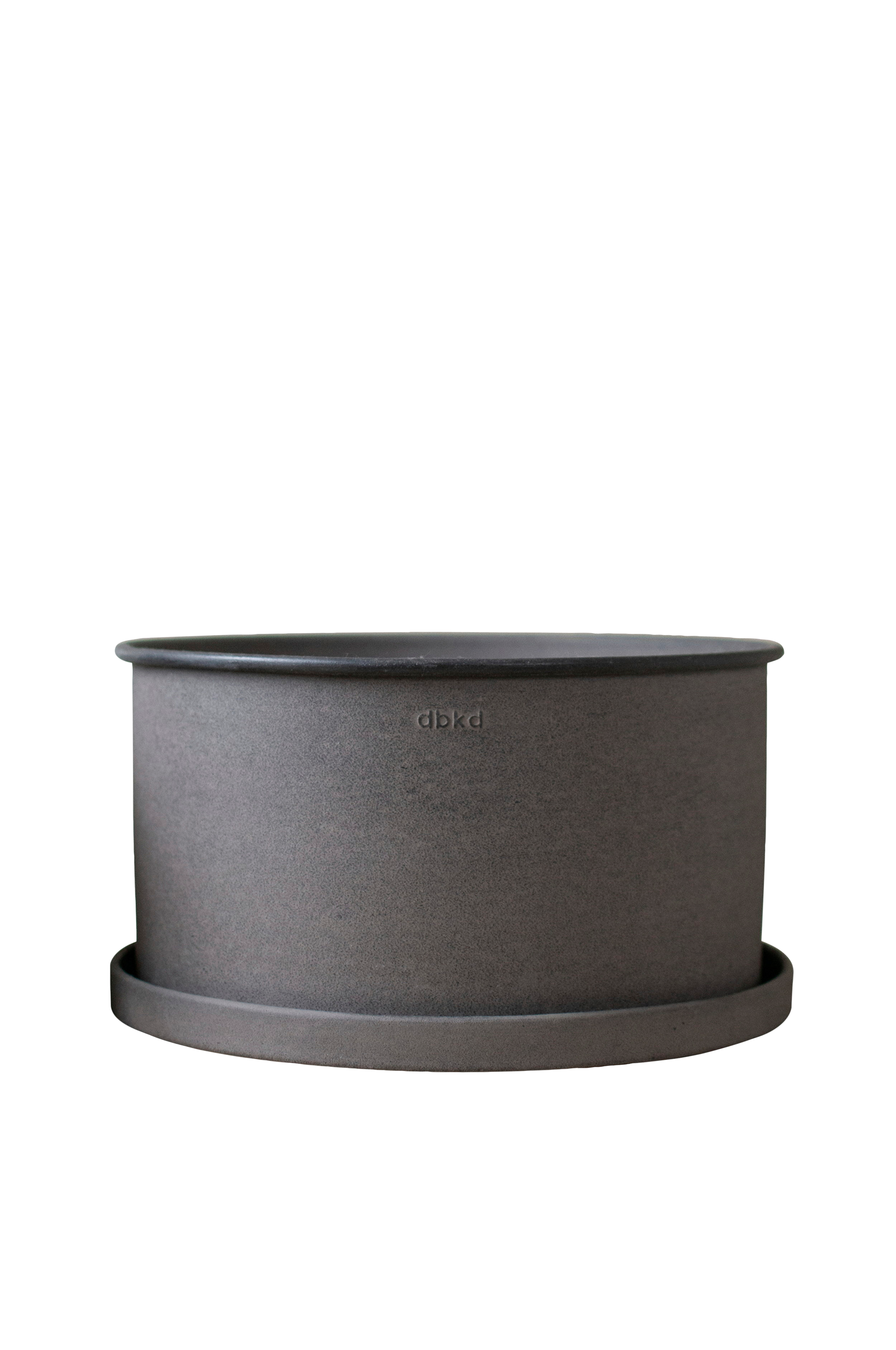 En udendørskrukke med tilhørende underskål, lavet af glaseret blik, så den kan stå ude året rundt. Drænhul i bunden, der forhindrer at krukken fyldes med vand. Dette hul kan lukkes med den medfølgende plastprop. Tåler frost. Kan anvendes indendørs og udendørs. Højde 20 cm, diameter 35 cm.