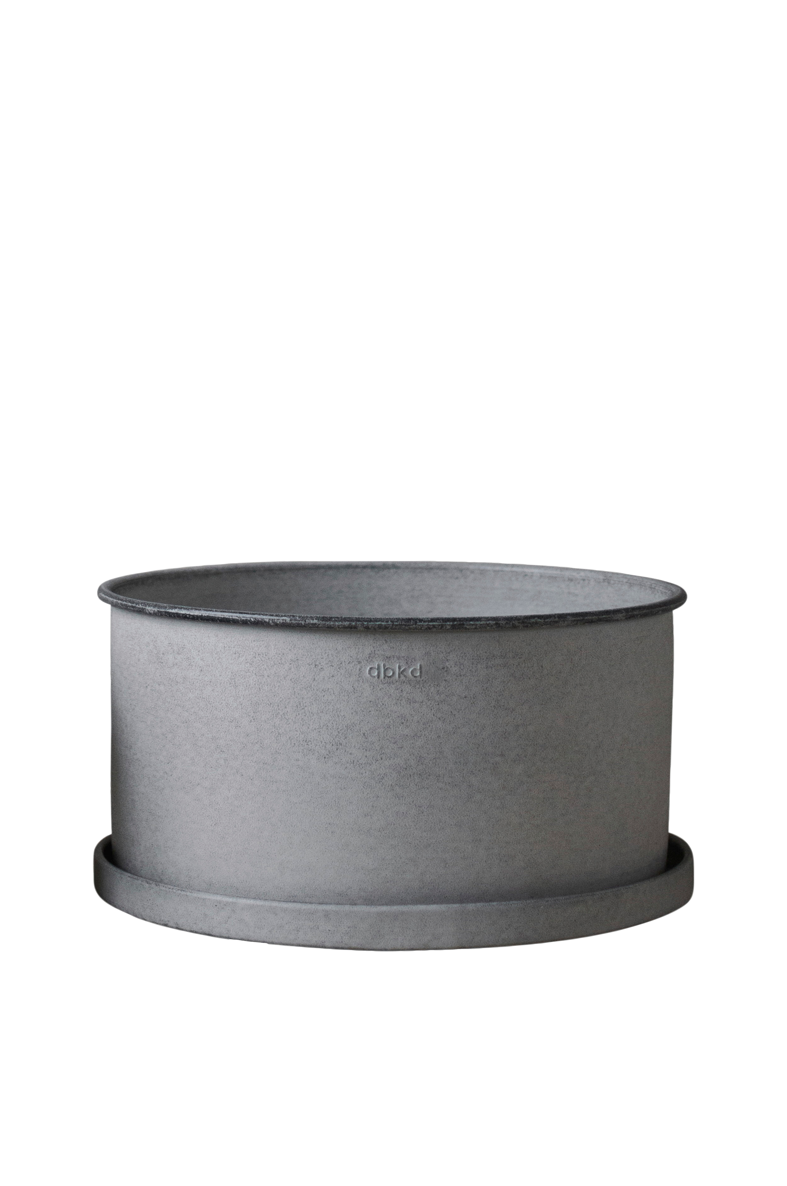 En udendørskrukke med tilhørende underskål, lavet af glaseret blik, så den kan stå ude året rundt. Drænhul i bunden, der forhindrer at krukkerne fyldes med vand. Dette hul kan lukkes med den medfølgende plastprop. Tåler frost. Kan anvendes indendørs og udendørs. Højde 20 cm, diameter 35 cm