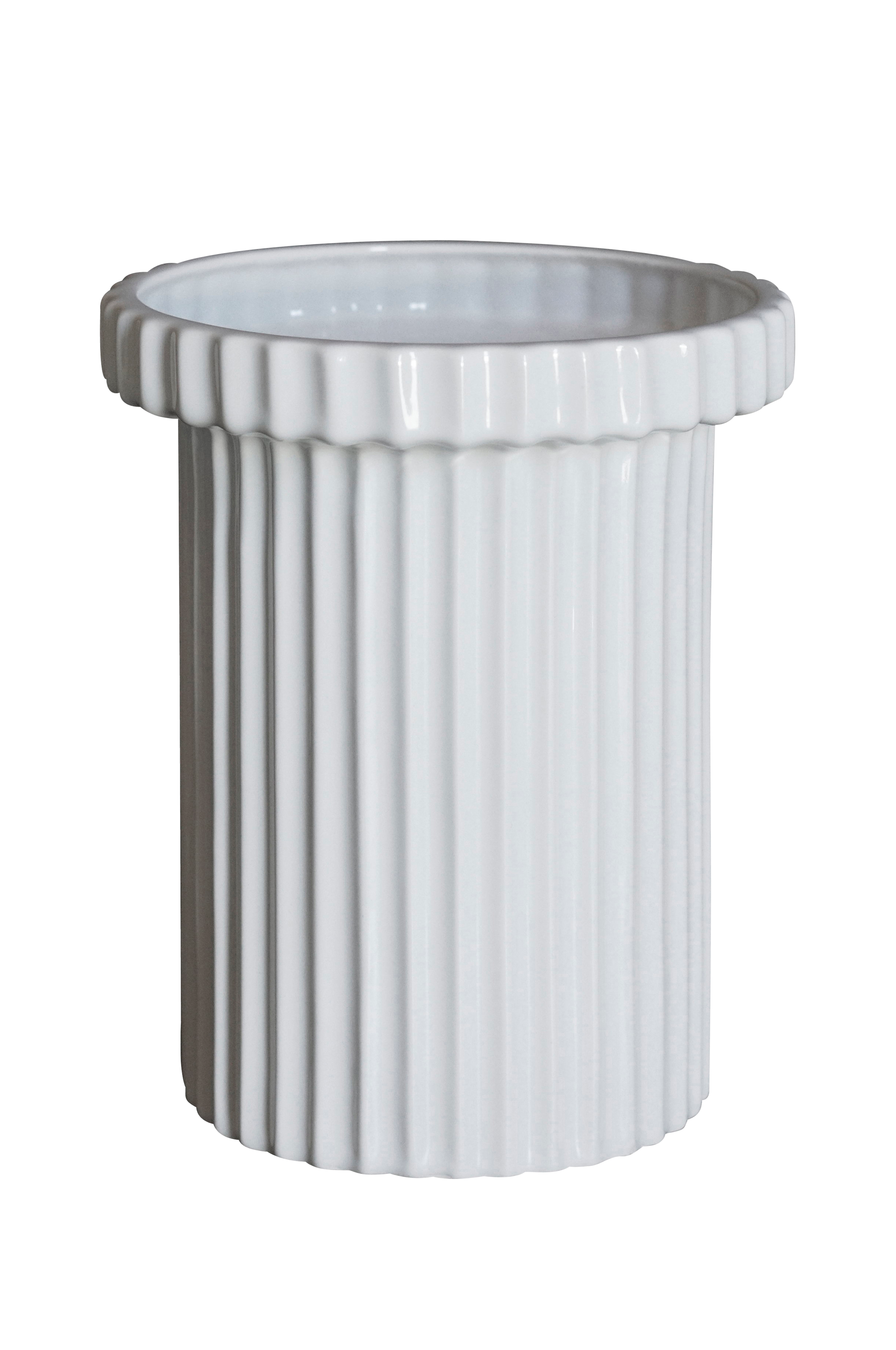 Krukke i keramik med stribet overflade. Diameter 12 cm, højde 18 cm.
