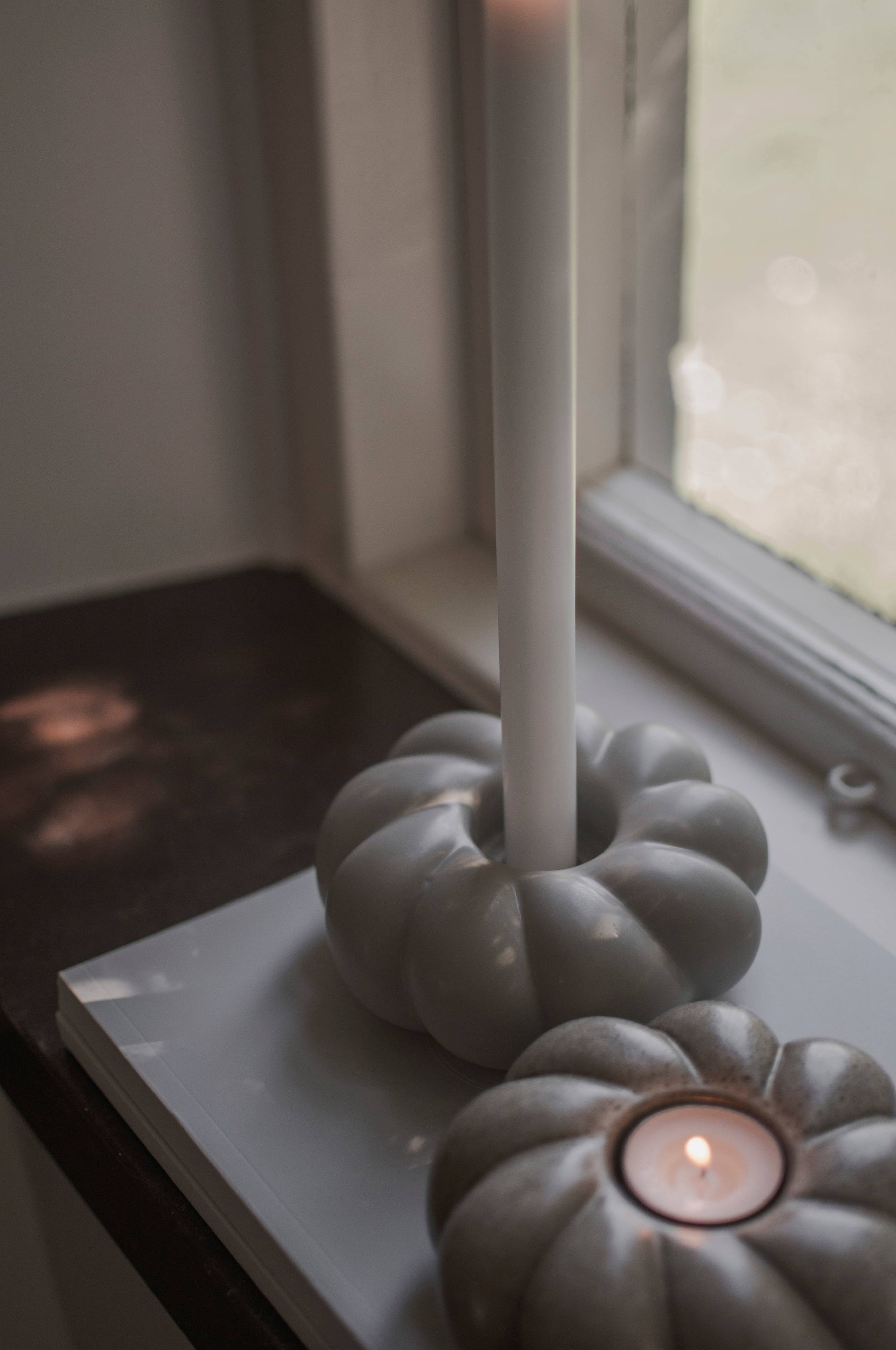 Lysholder som kan anvendes med både lys og fyrfadslys. Mål: 14 cm i diameter, højde 6 cm.