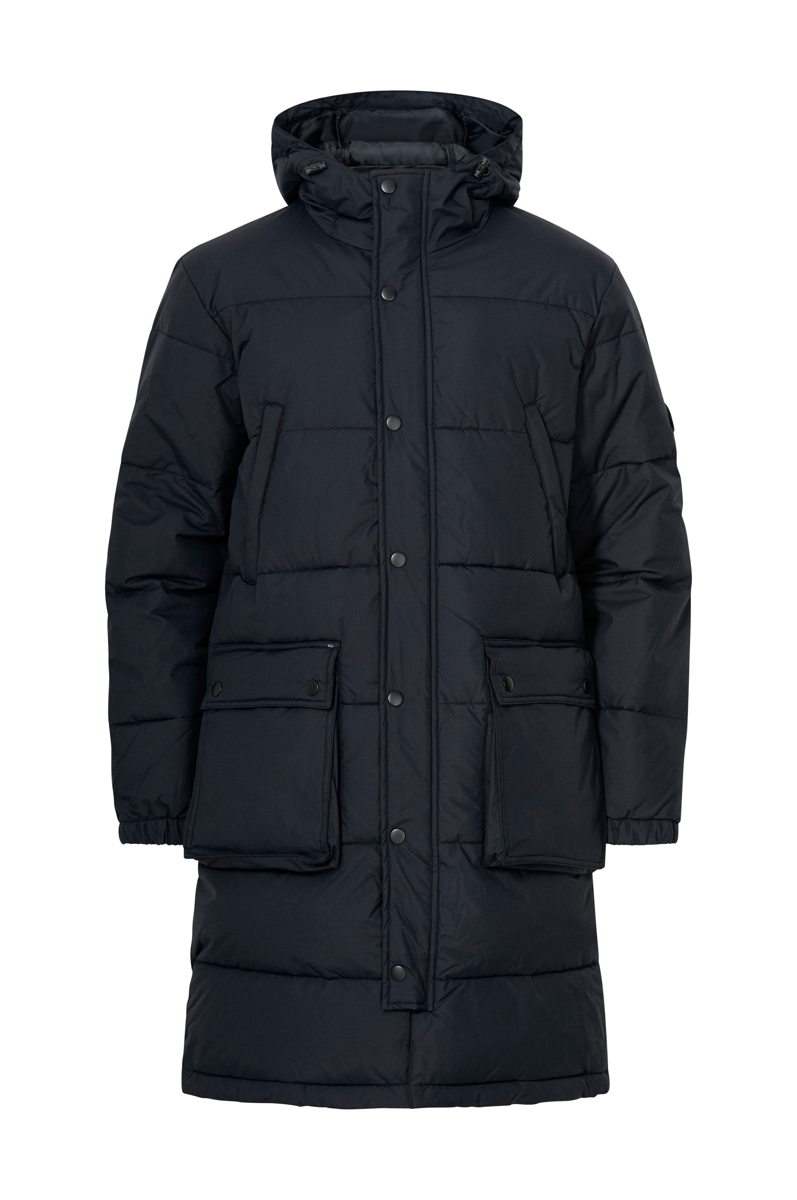 • Quiltet jakke med vandafvisende stof• Lang model• Fast hætte med træksnørre• Lynlås• Vindflap med trykknapper• To lommer med trykknapper• To brystlommer med lynlås• Elastisk bånd ved manchetterne• Længde: 106 cm i størrelse M