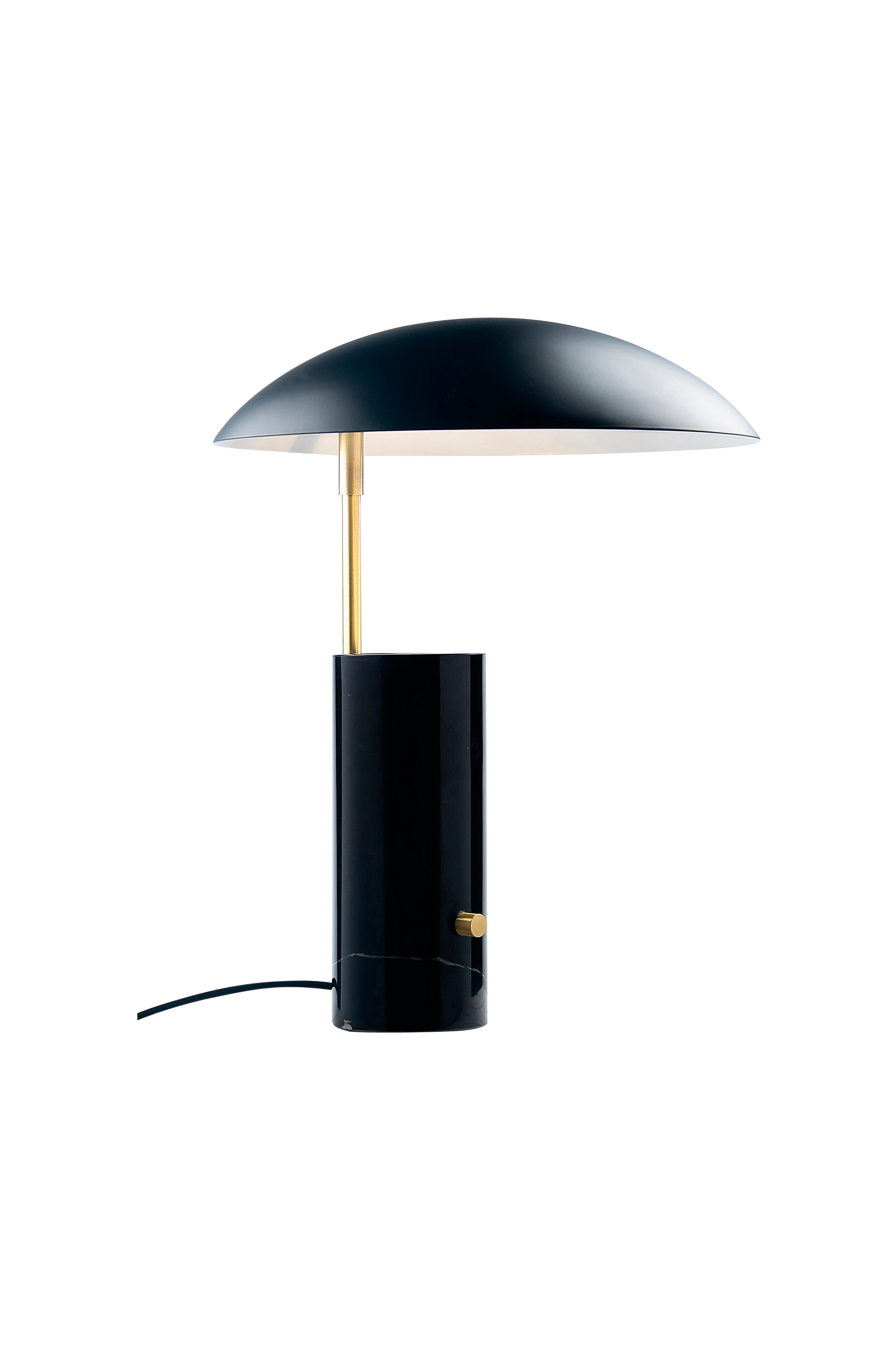 Mademoiselles fra det danske designstudie mavro/lefèvre har et sjovt og let designudtryk, hvor den runde, overdimensionerede skærm afbalanceres af den solide marmorbase. Lyset reflekteres opad på bunden af skærmen og skaber en blød, indirekte stemning.