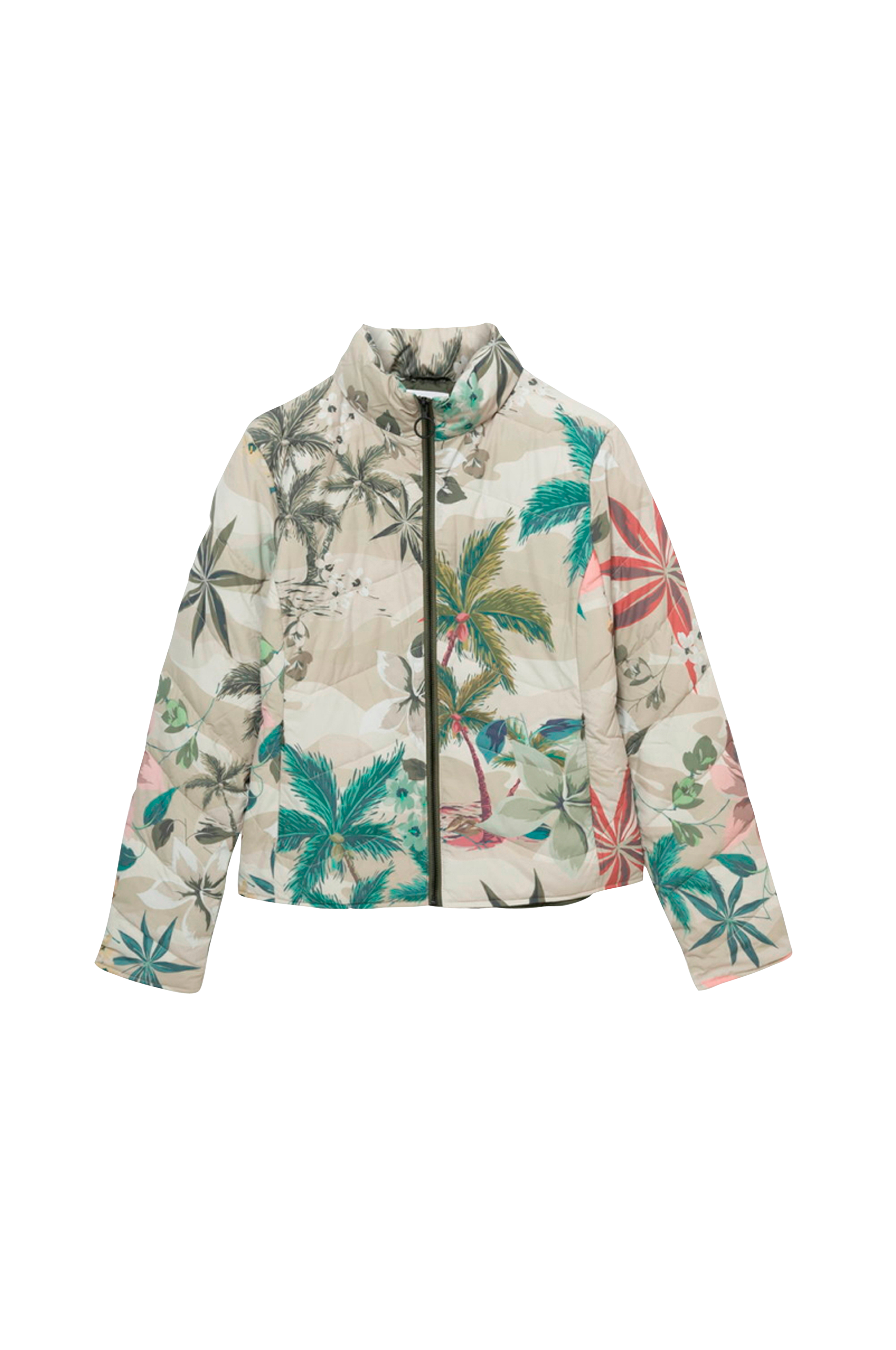 Let vatteret model med quiltning og lynlås foran, som fortsætter helt op i kraven. To indsatte lommer med skjult lynlås og afrundet kant forneden bagpå, som er lidt længere. Længde bagpå ca. 59 cm i str. S.