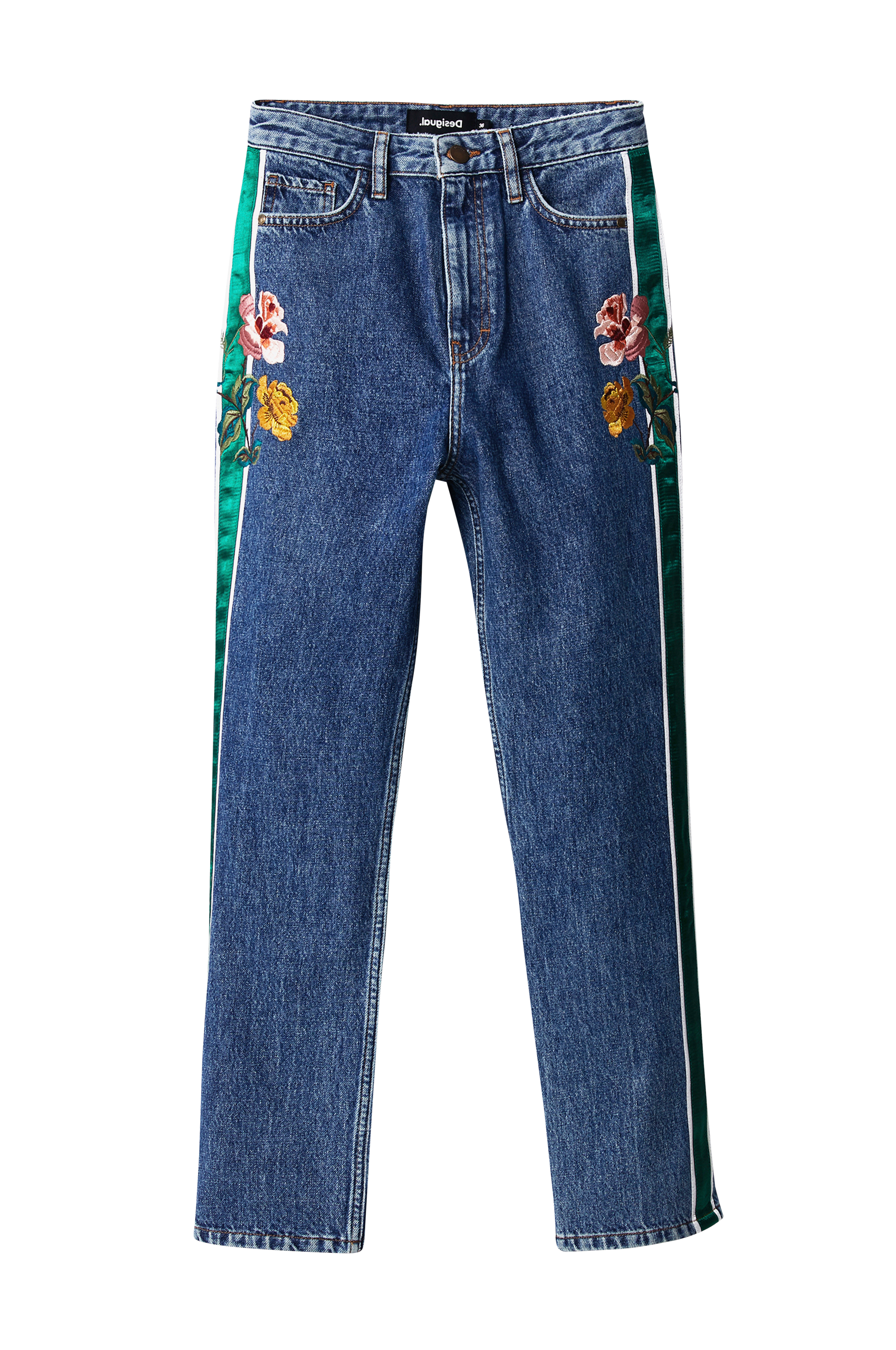 • Ankellang, lige model• Strop i satin langs siderne• Broderede blomster foran og bagpå• Høj talje• Gylp med lynlås• Fem lommer• Fremstillet af denim