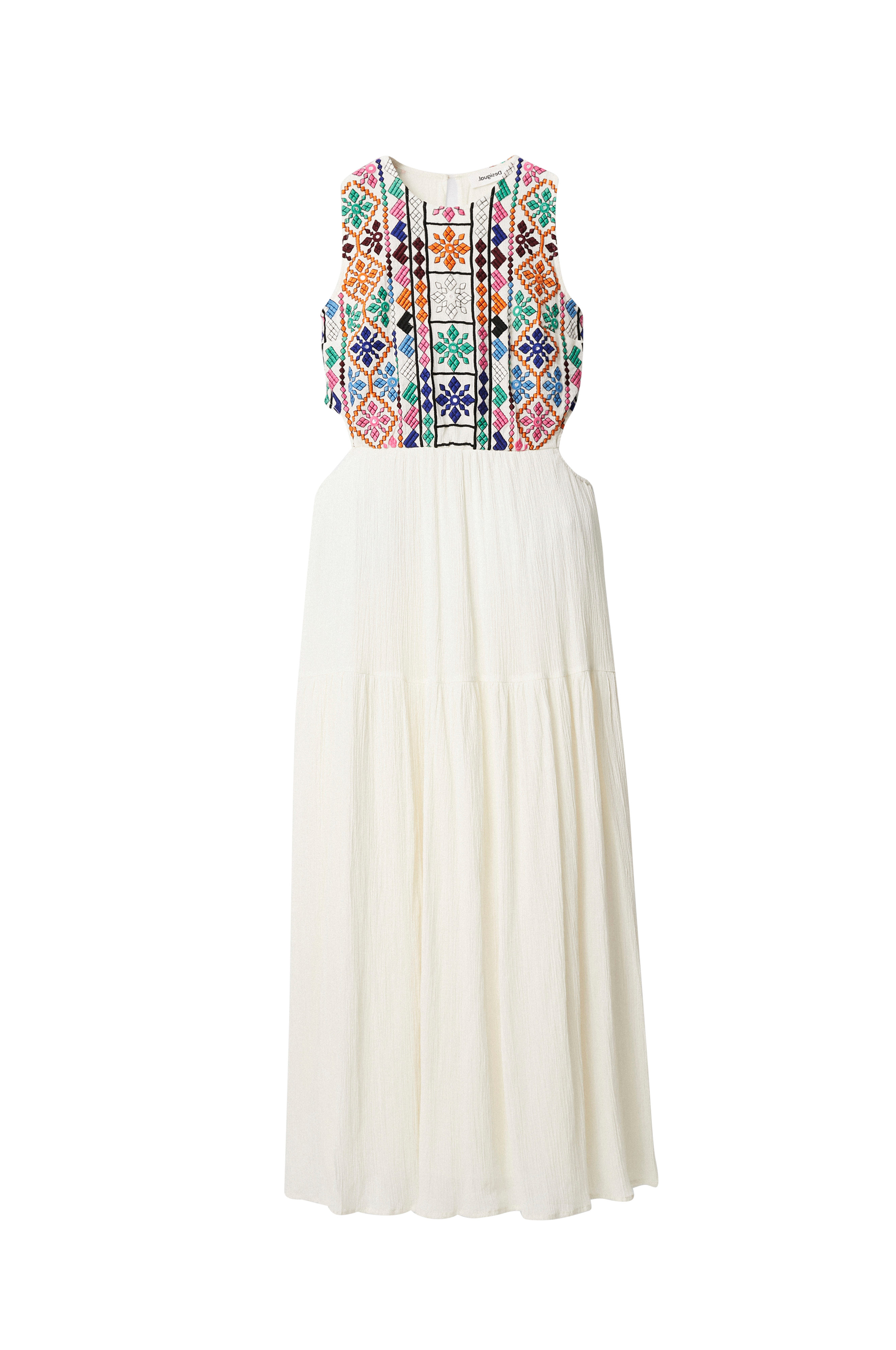• Ærmeløst design• Farverigt broderi oppe foran• Udskæring ved taljen• Ventilation med knap i nakken• Let krøllet kvalitet• Foret• Længde: 128 cm i størrelse M