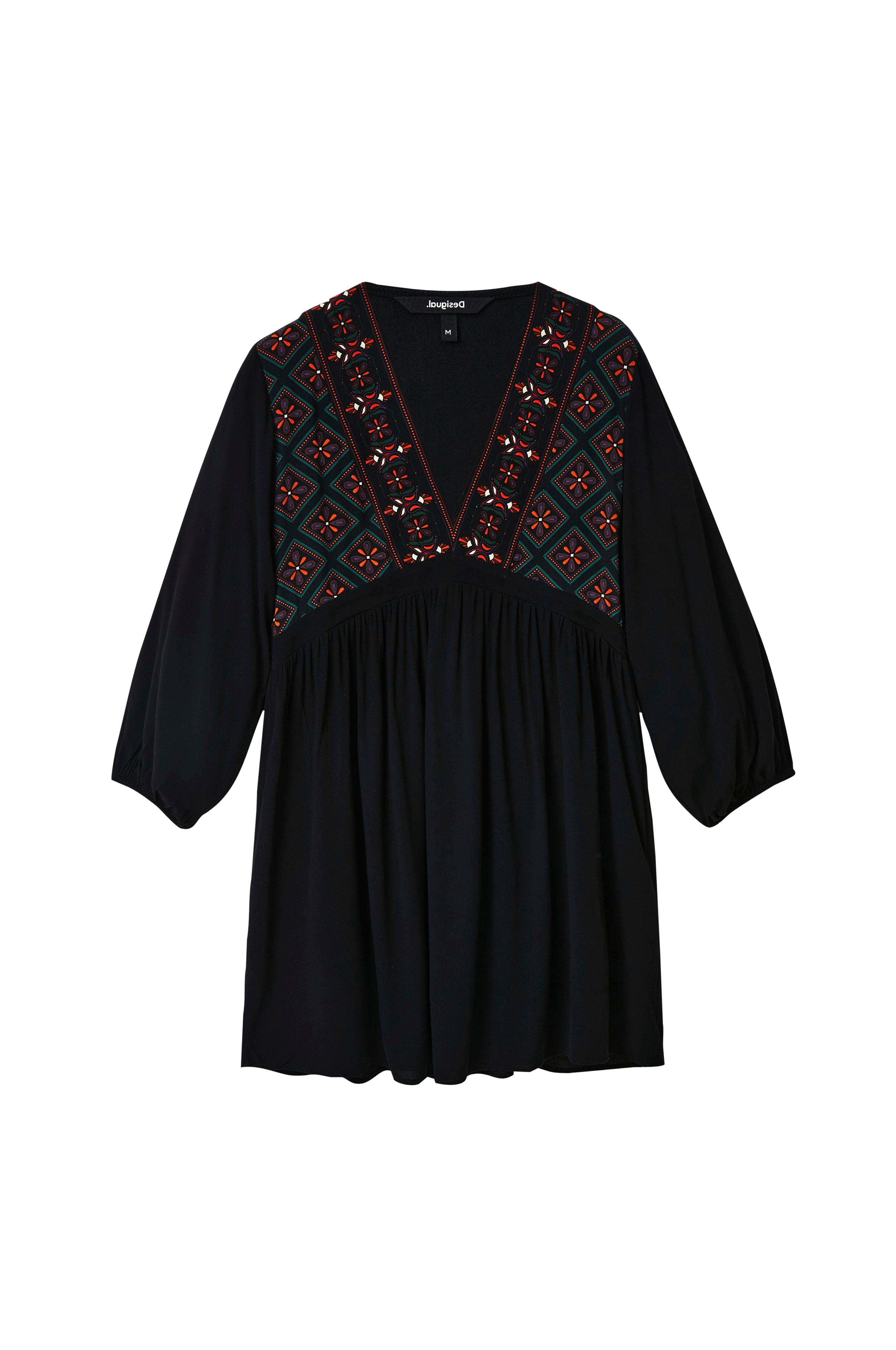 • Oversize model med svaj• Dyb v-udskæring foran• Udskæring med samling ved taljen• Bredt, 3/4 langt ærme med elastiske manchetter• Længde: 87 cm i størrelse S