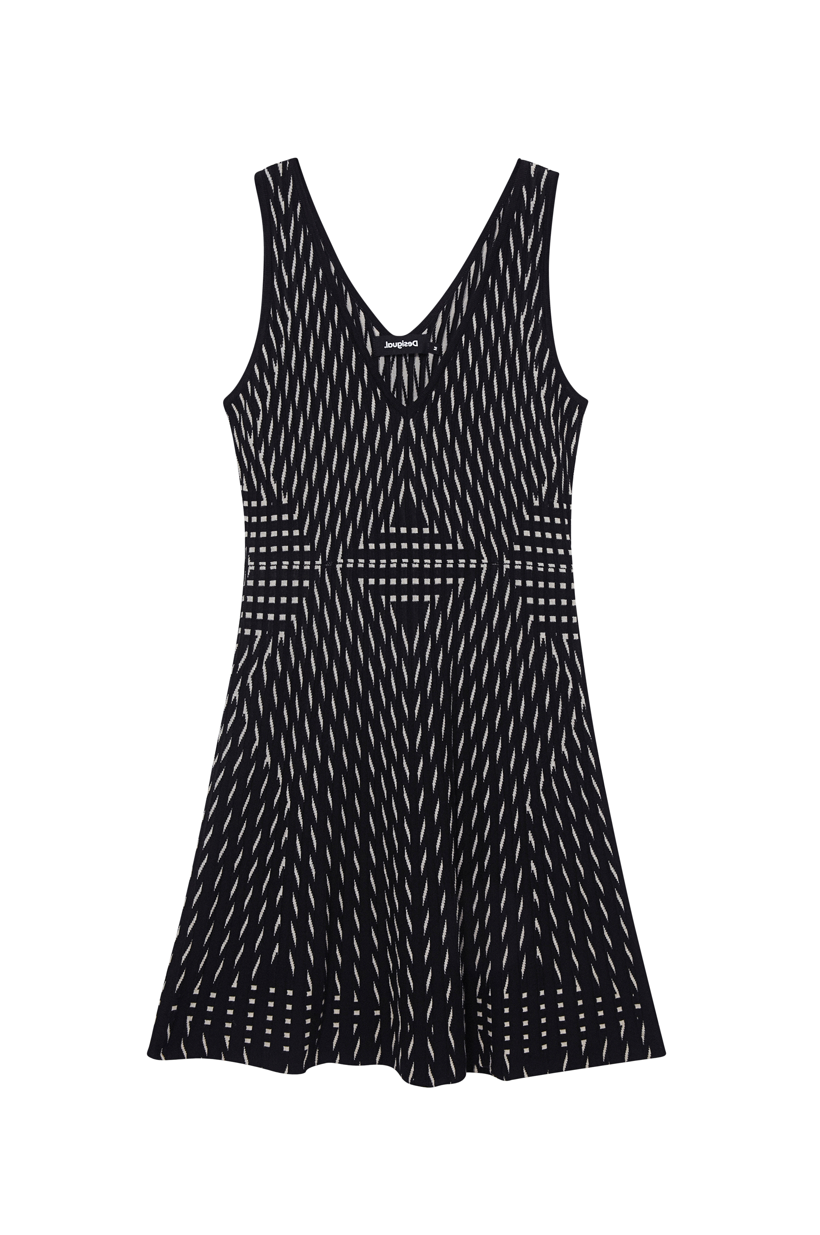 • Ærmeløs model med v-udskæring foran og bagpå• Nederdel med svaj• Strikket mønster• Længde: 85 cm i størrelse S