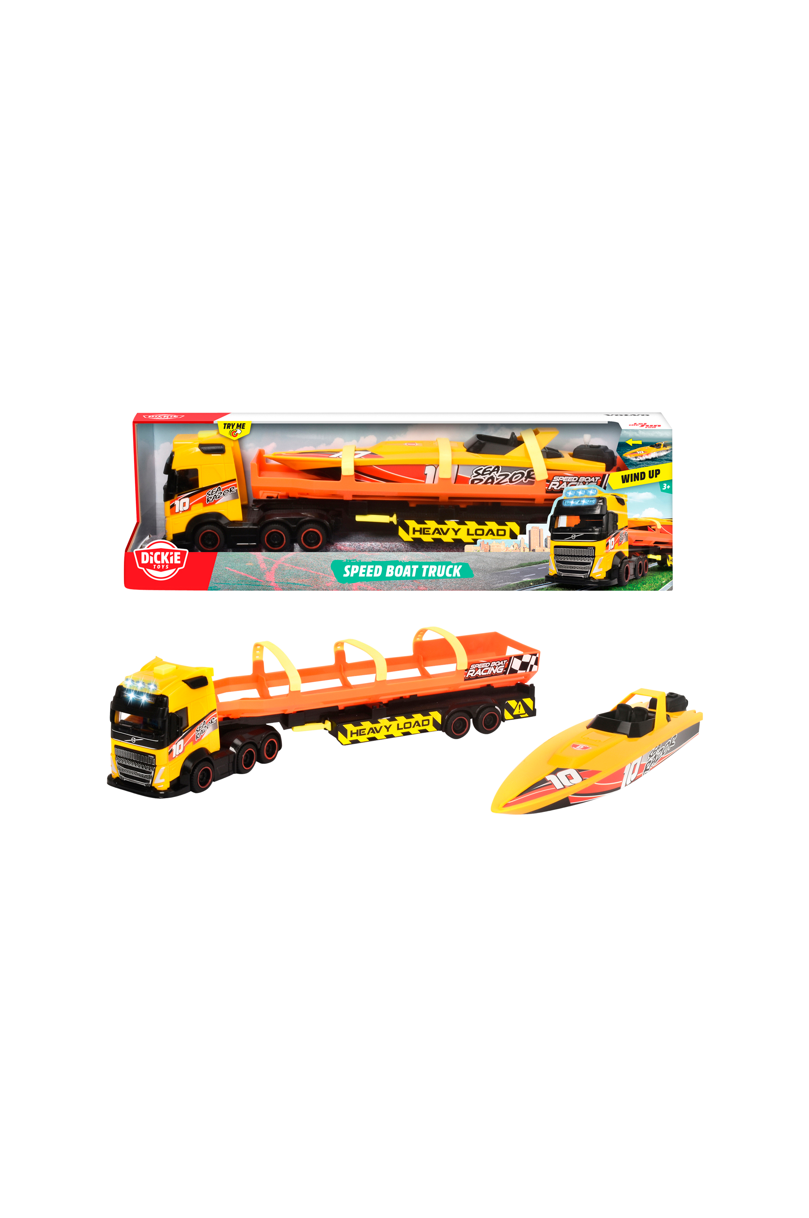 Dickie Toys Volvo lastbil med anhænger, frihjul, interiør, lys og lyd. Båd med trækfunktion medfølger.