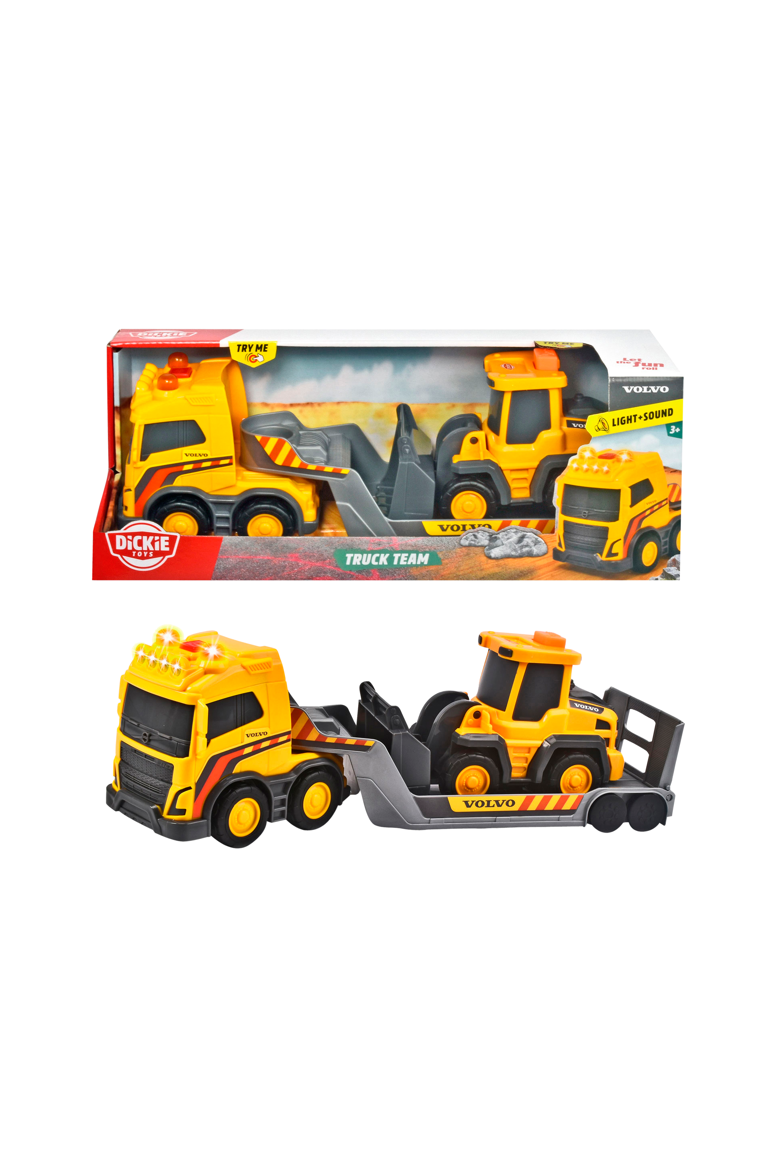 Lastbil fra Dicke i Volvo-model. Med friløb, lys, lyd og aftagelig trailer. Hjullæsser (9 cm) med bevægelig skovl medfølger som kan transporteres på trailer.