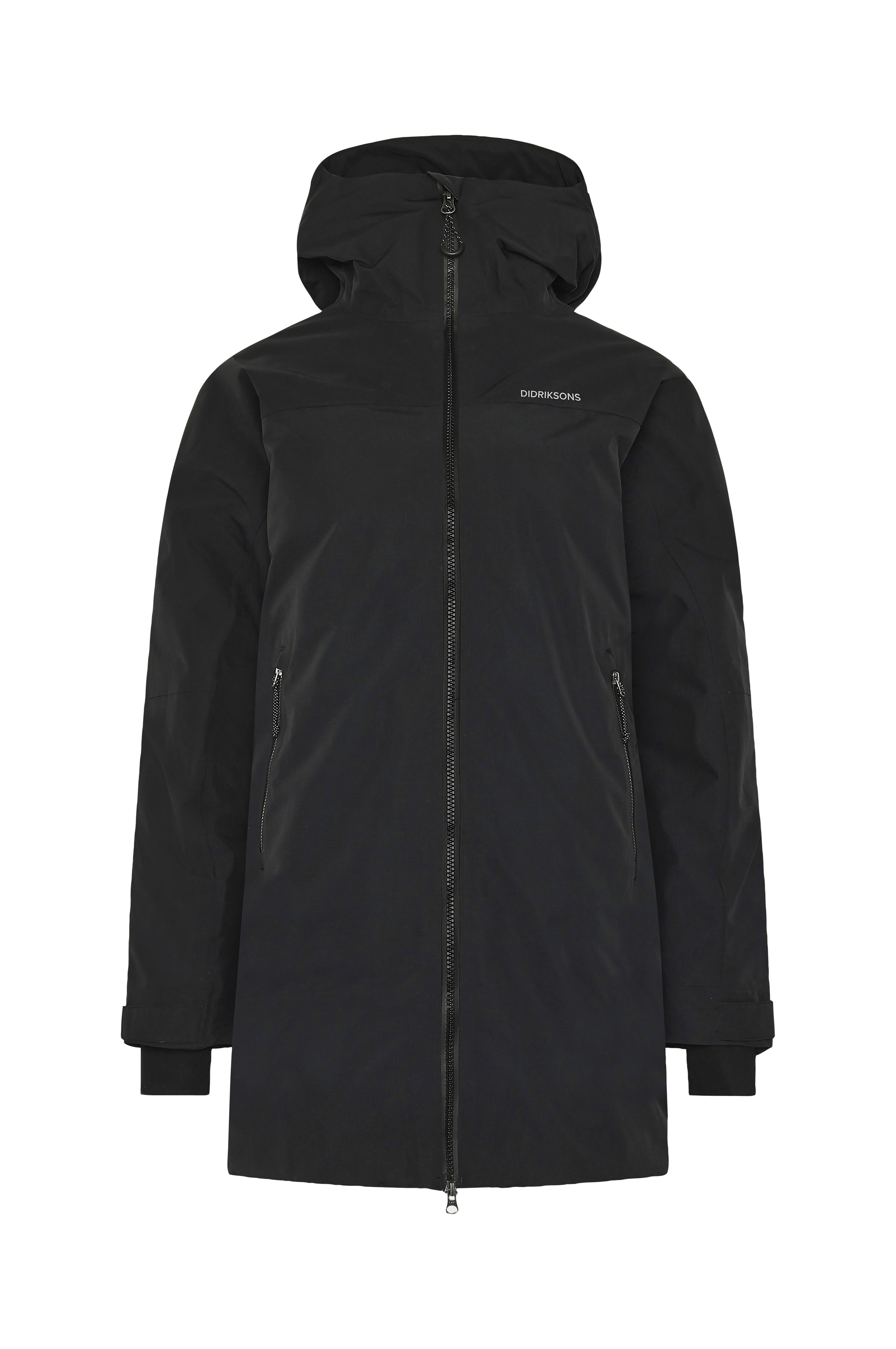 • Vandtæt, vindtæt, let foret model med god åndbarhed • Fast, justérbar hætte • To-vejs lynlås med hagebeskytter • To forlommer med lynlås • Justérbar ærmeafslutning med velcrobånd og indvendige ribmanchetter • Længde: 92 cm i størrelse 36