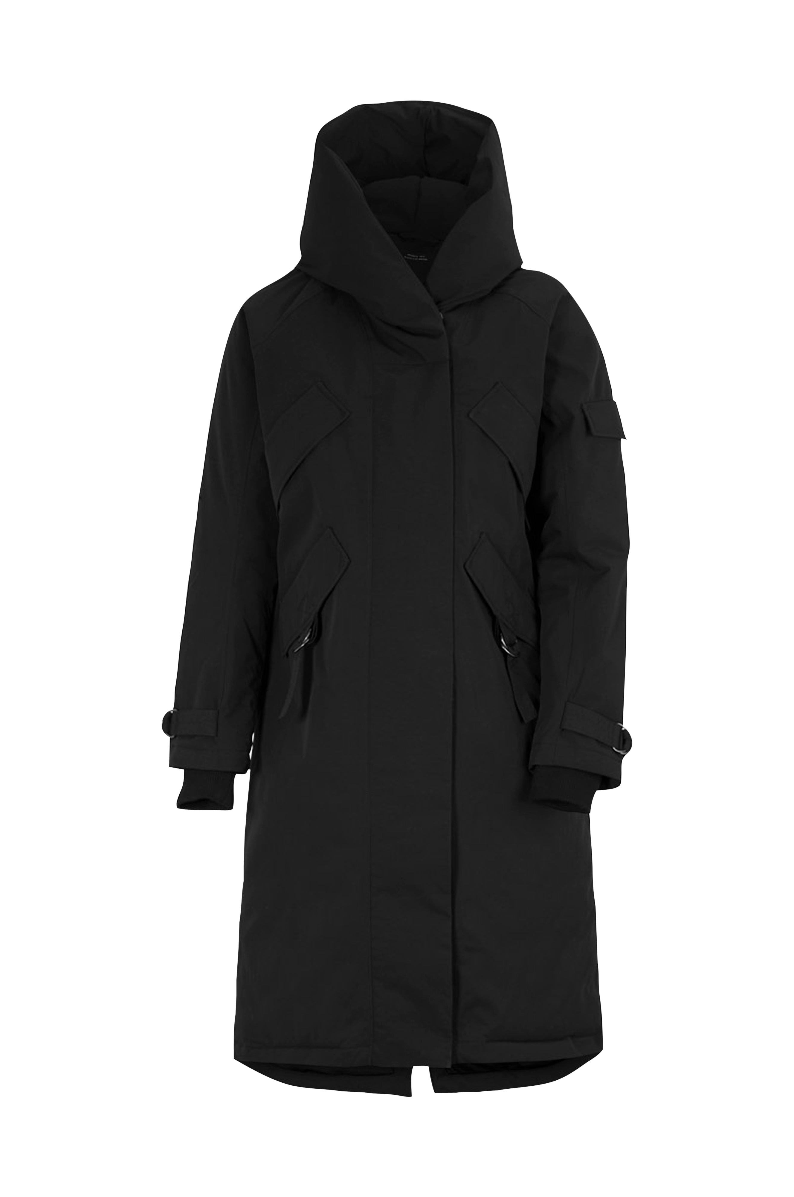 En lang, vatteret parkacoat i oversizemodel. Den er 100% vind- og vandtæt med en quiltet inderside. Parkacoaten har et mat og blødt udtryk, er fremstillet i genindvundet polyamid og har en vattering som består af 75% genindvundet polyesterfiber.