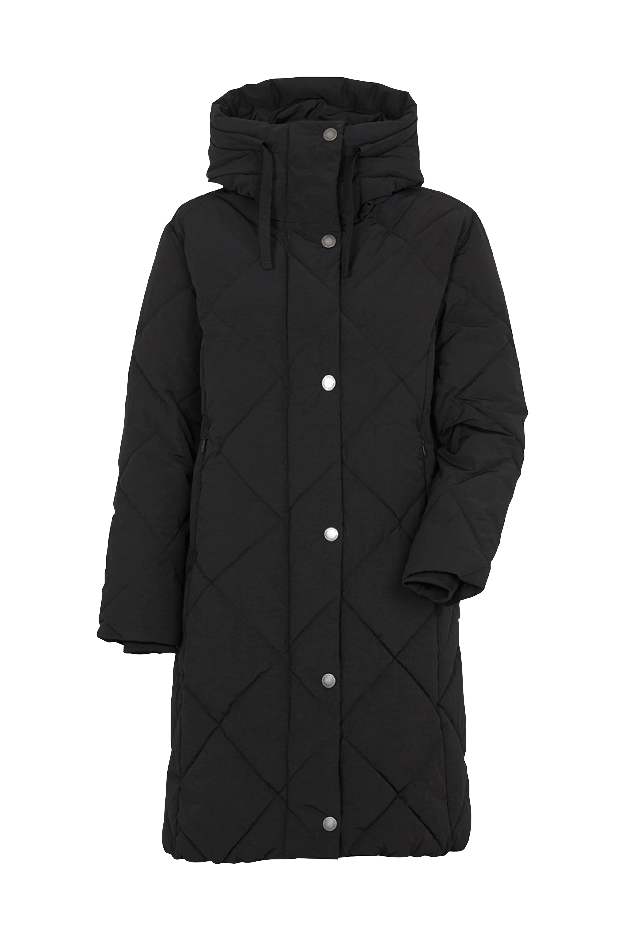 En vatteret, quiltet parkacoat med stor hætte og moderne design. Den har en løs pasform med en lige silhuet. Stoffet er vandafvisende med god åndbarhed. Fast, justerbar hætte og 2-vejslynlås foran med beskyttende overfald som lukkes med trykknapper. To sidelommer med lynlås og en inderlomme med knap. Parkacoaten er vatteret med løse polyesterfibre som giver en fin volumen og varme. 75% af fibrene er genindvundet polyester. Længde ca. 101 cm i str. 36.