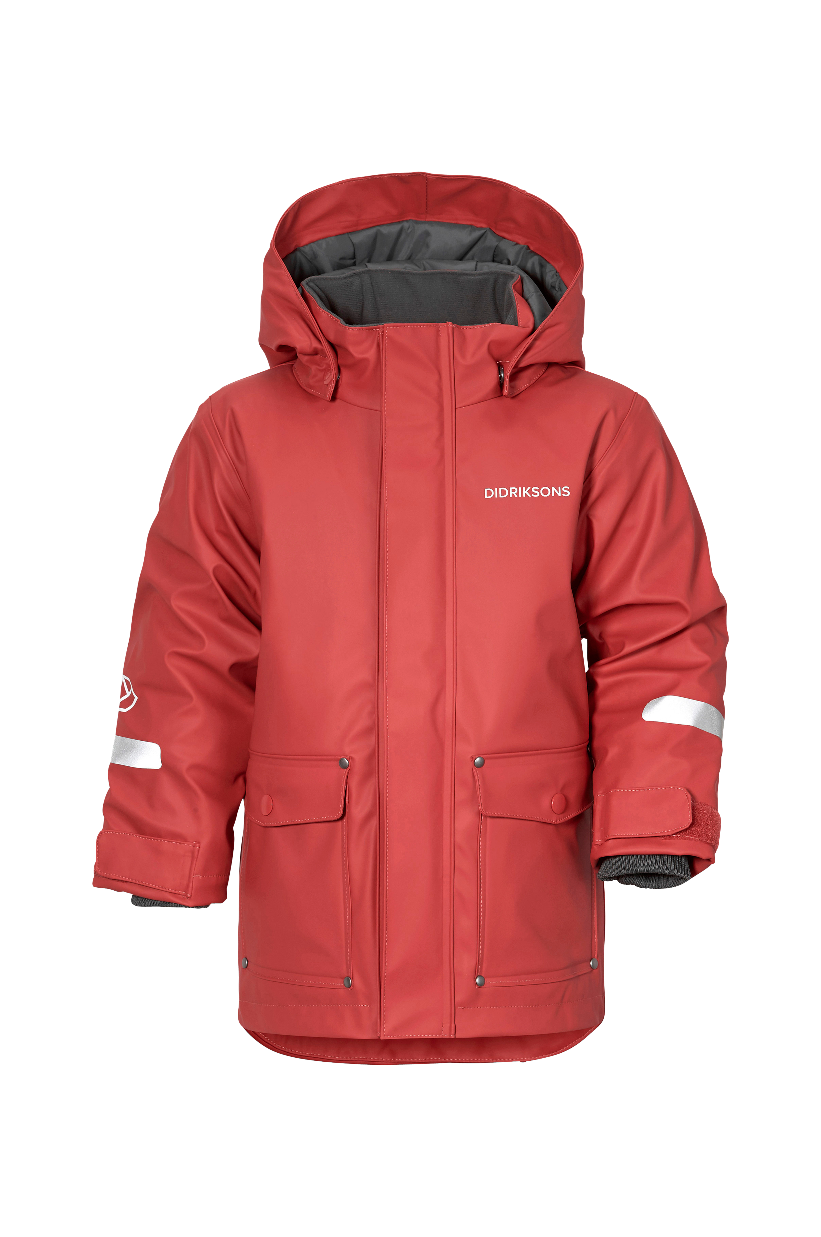 En vatteret regnjakke i Galon® med en dyneinderside for bedre varmeisolering. Den er helt vind- og vandtæt med svejsede sømme for en 100% vandtæt konstruktion. Normal pasform. Ærmekanterne er justerbare. Aftagelig hætte og gennemgående lynlås midt foran med beskyttende overfald. Refleksdetaljer. To forlommer med knapper. Vatteringen er fremstillet af genindvundne fibre
