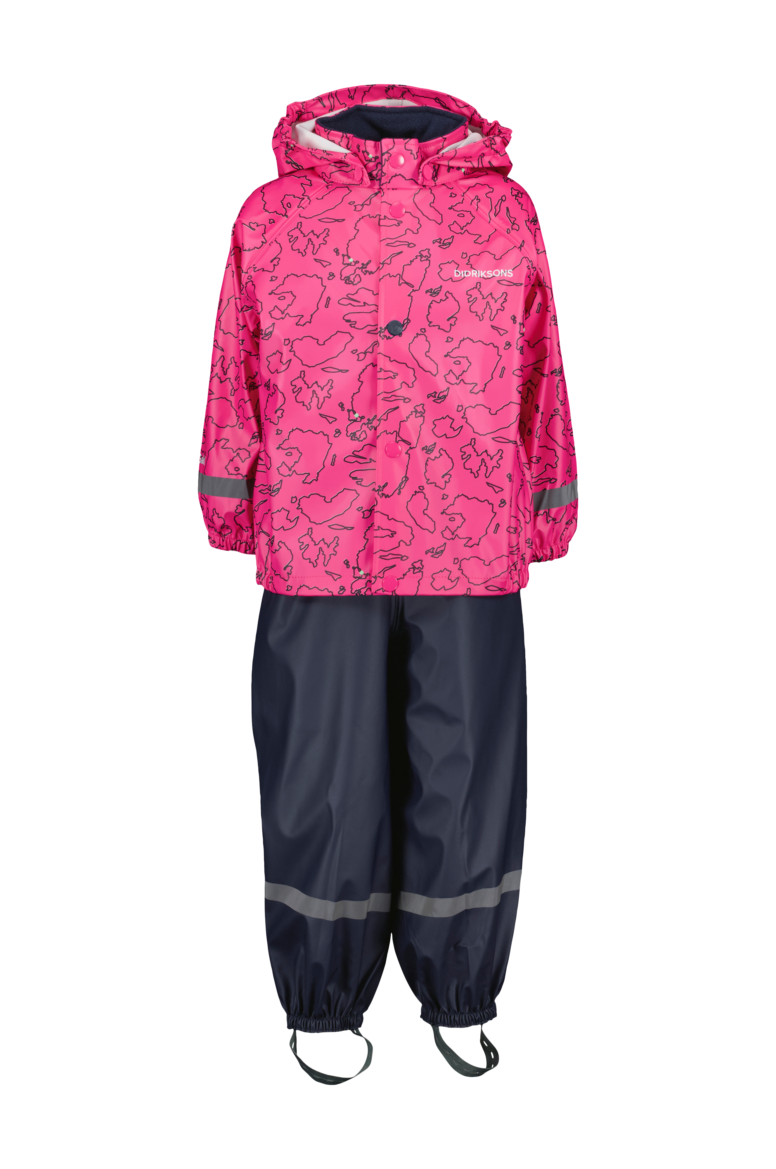 Regnsæt i vand- og vindtæt Galon® med svejsede sømme og blød jerseyinderside. 4-vejsstretch. Jakke med aftagelig hætte som har elastik i siderne. Standkrave med blød fleece på indersiden. Jakken er noget længere bagpå. Trykknapper foran og indsat elastik i ærmekant samt forneden i siderne. Bukser i høj smækmodel med regulerbare, elastiske seler og trykknapper i siderne for regulerbar talje. Indsat elastik i benkant og aftagelige, regulerbare og elastiske fodstropper. Refleksdetaljer hele vejen rundt.