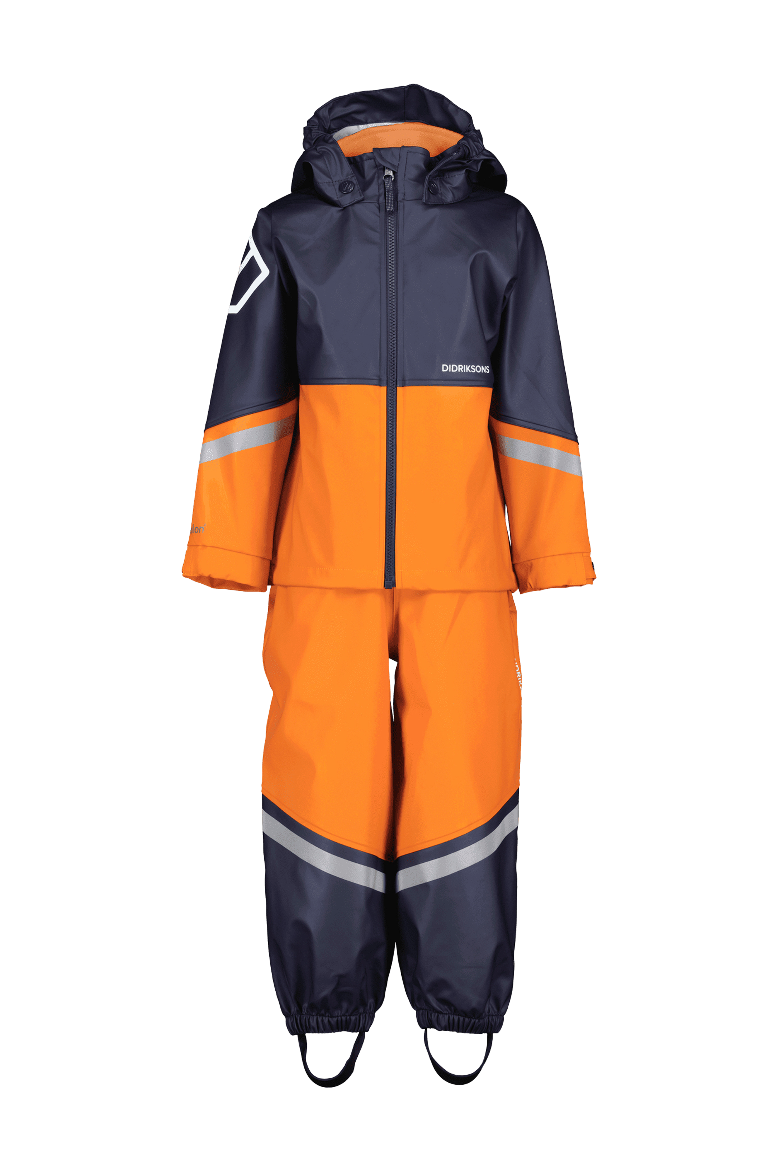 • 2-delt regnsæt i vandtæt, vindtæt Galon• Forseglede sømme• Uforet model med firevejsstræk• Aftagelig hætte med elastik i siderne• Høj, fleeceforet krave• Lynlås• Justérbare seler• Trykknapper i siderne• Elastik ved enden af benene• Aftagelige fodstropper i silikone i silikone• Reflekterende detaljer