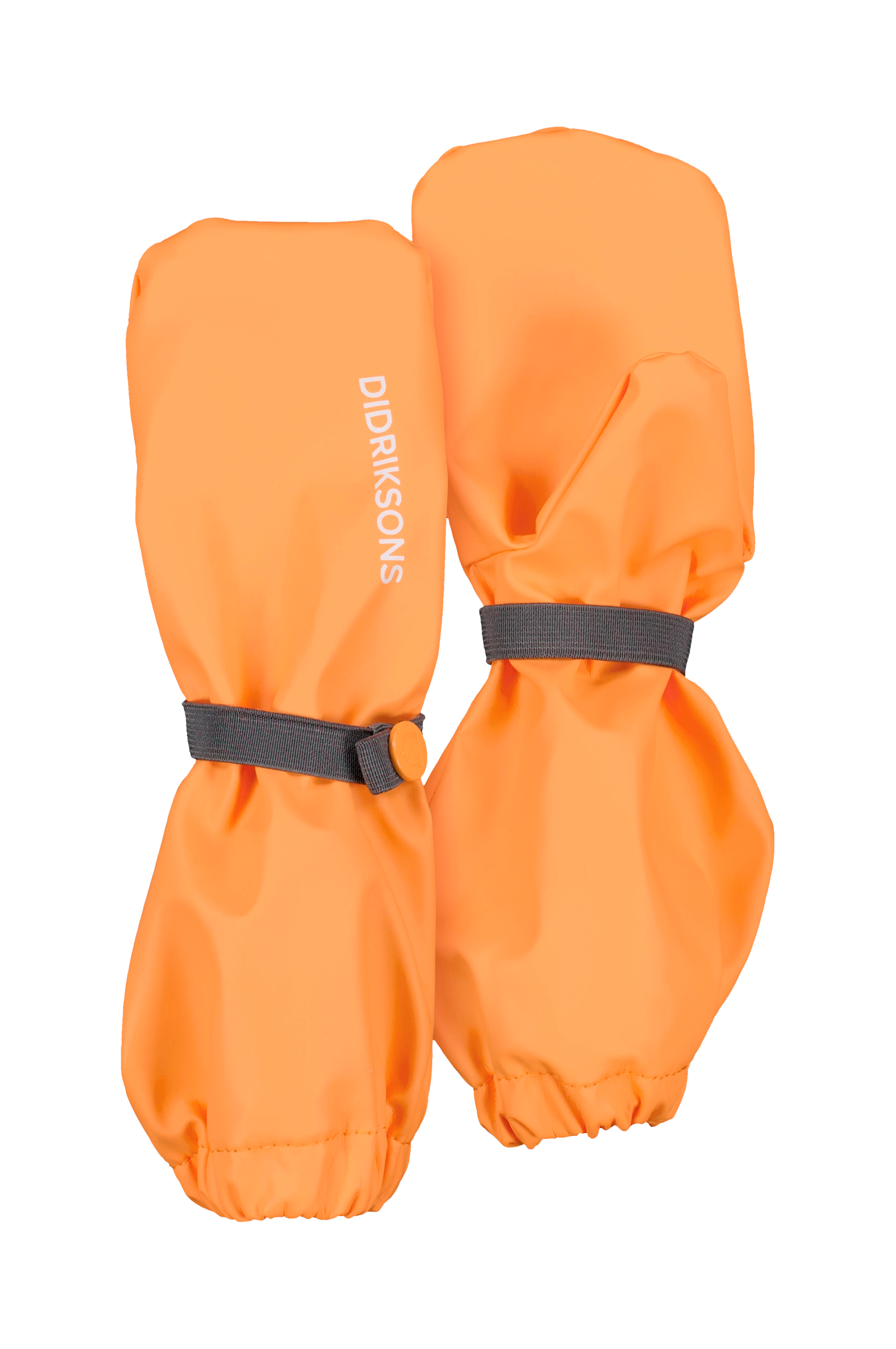 Vanter i vind- og vandtæt Galon® med svejsede sømme. Inderside i tynd jersey. Passer perfekt til leg udenfor. Rundt om håndleddet sidder et elastikbånd med trykknap for at gøre det nemt at tage lufferne af og på. Skaftkanten som går op på armen, har elastikkant. Elastiske stropper til at sætte om håndleddet.