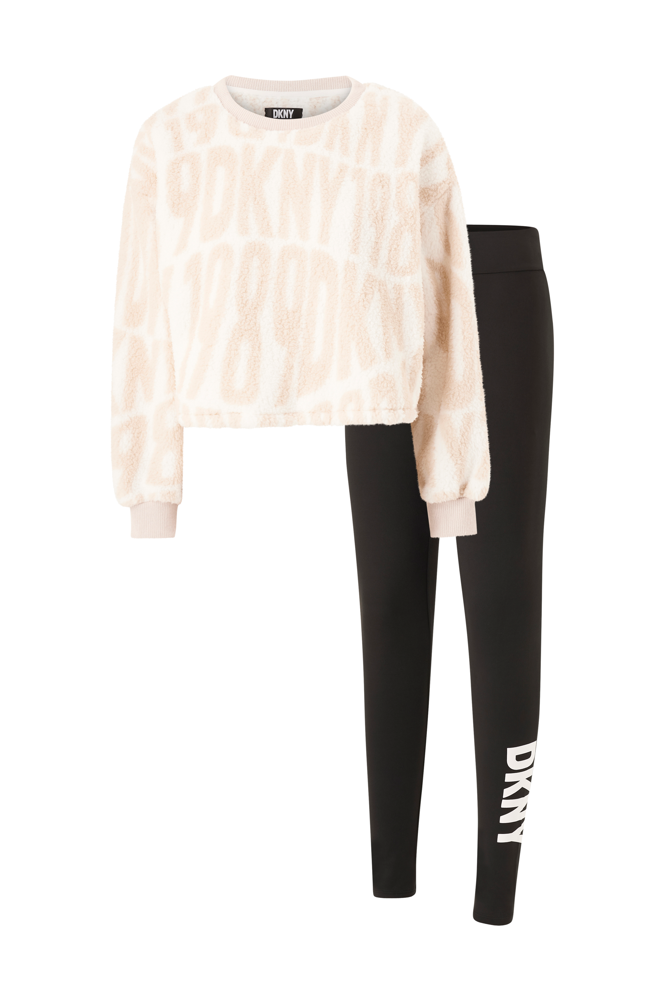 • Blød, bred trøje i teddy• Rund, ribstrikket halsudskæring• Nedsænket skulder med langt ærme og ribmanchet• Stramme leggings med bred kant på toppen og tryk på det ene ben