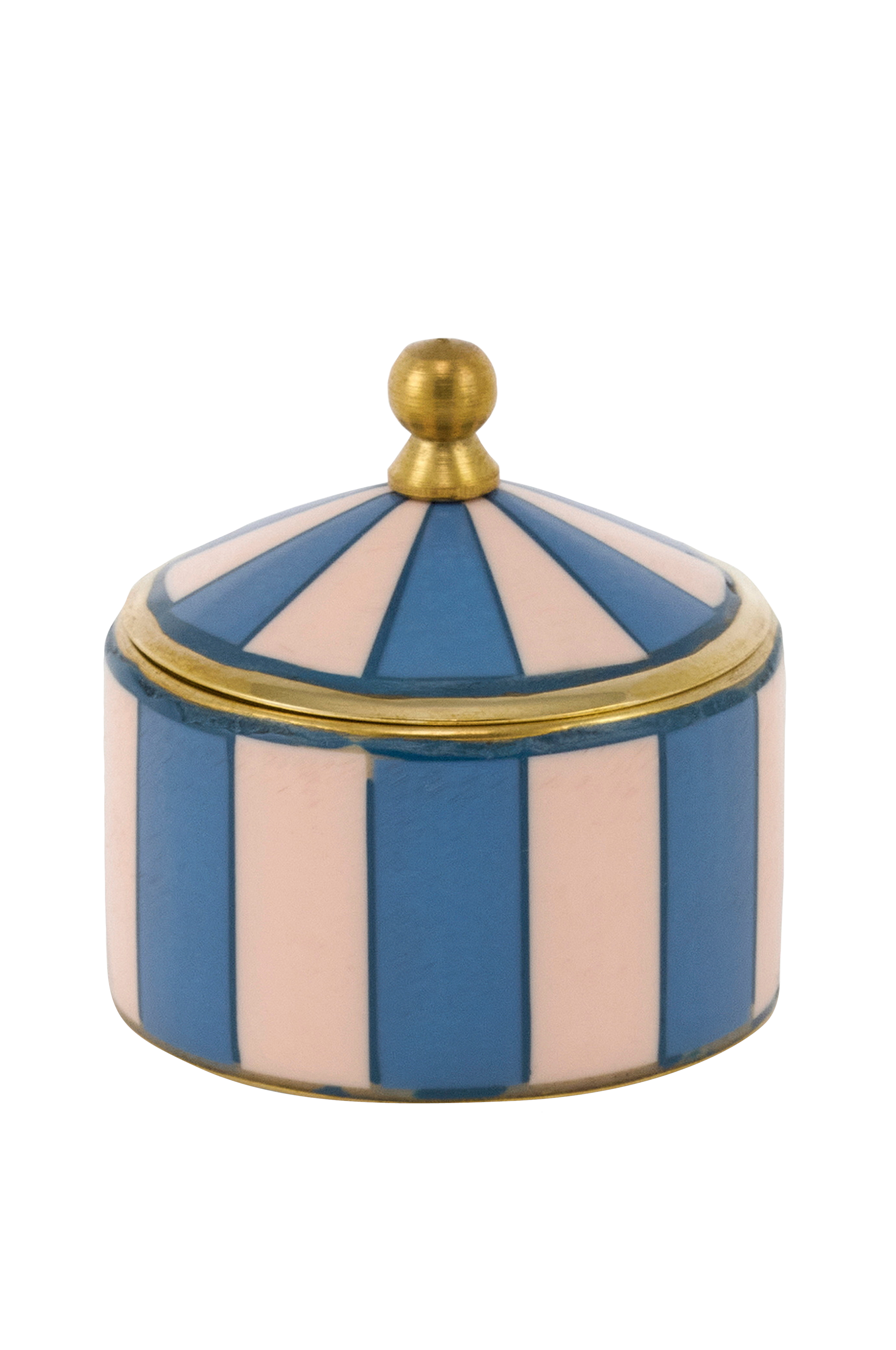 Forskøn dit rum med Bailey Circus Box Blue, en smukt håndlavet æske, der kombinerer legende charme med raffinement. Den er både dekorativ og praktisk med et dejligt blue og pink stribet mønster med gyldne messingdetaljer. Den kompakte størrelse (5 x 5 x 5 cm) er perfekt til opbevaring af smykker, nipsgenstande eller andre små skatte.