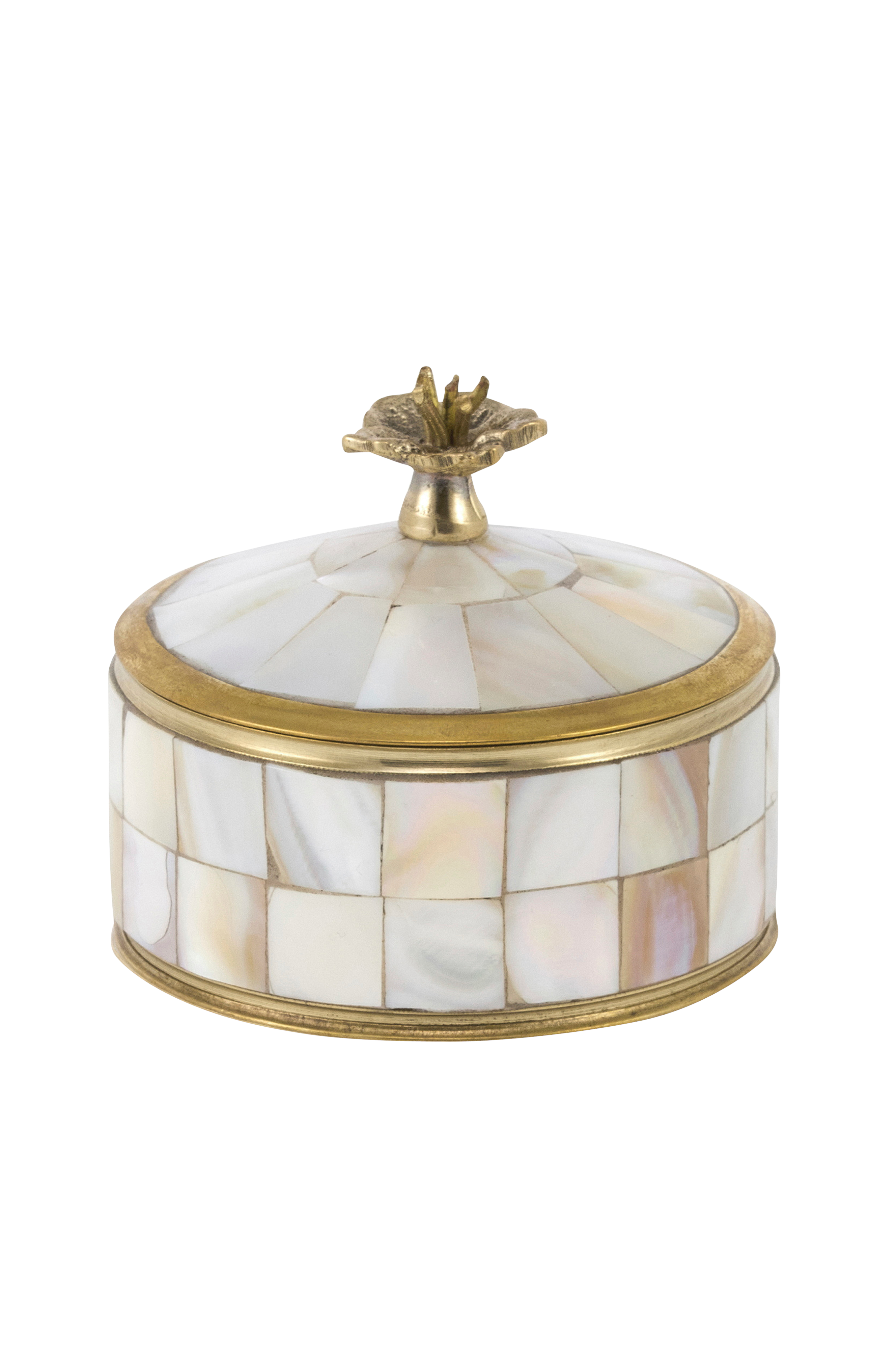 Tilføj et strejf af elegance til dit rum med Maisie Circus Box Pearly. Denne smukt håndlavede æske har en strålende off-white pearly finish kombineret med messingdetaljer, hvilket gør den både funktionel og dekorativ. Den måler 7 x 7 x 5 cm og har den perfekte størrelse til opbevaring af smykker, nipsgenstande eller andre små skatte.