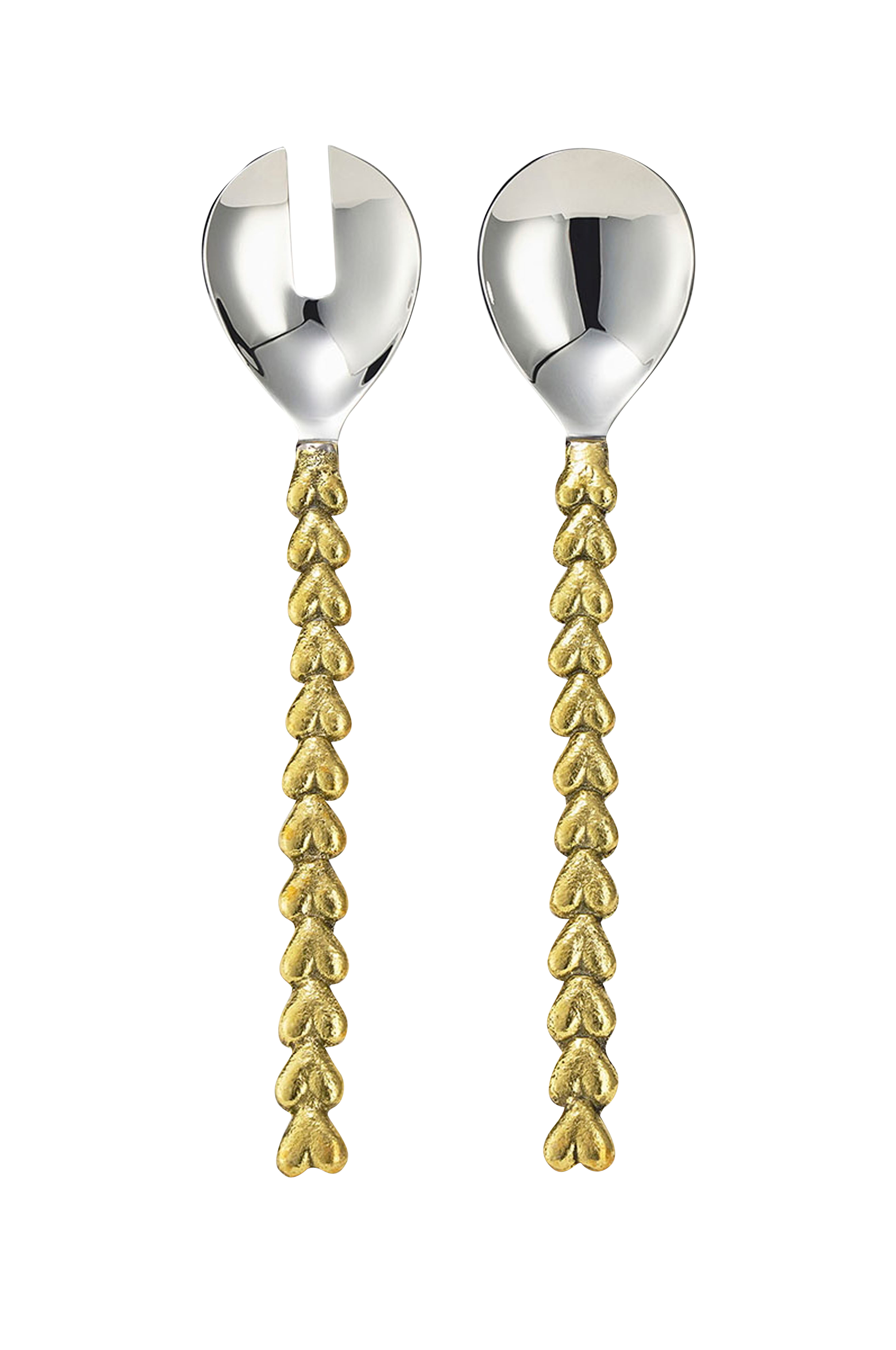 Tilføj et romantisk og stilfuldt touch til dit spisebord med Holly Heart salatsæt. Dette smukke sæt indeholder en salatskje og en salatgaffel, hver med et elegant håndtag dekoreret med en række delikate gyldne hjerter. Disse salatsæt er håndlavet af messing og rustfrit stål af høj kvalitet og er et sandt blikfang til enhver lejlighed. Med en længde på ca. 25 cm og en bredde på 5,5 cm ligger serveringsbestiket godt i hånden og er perfekt til at blande, servere og præsentere friske salater. Uanset om du tilbereder en grøn salat, en pastasalat eller en festlig ret, gør dette sæt enhver borddækning komplet. Produktdetaljer: