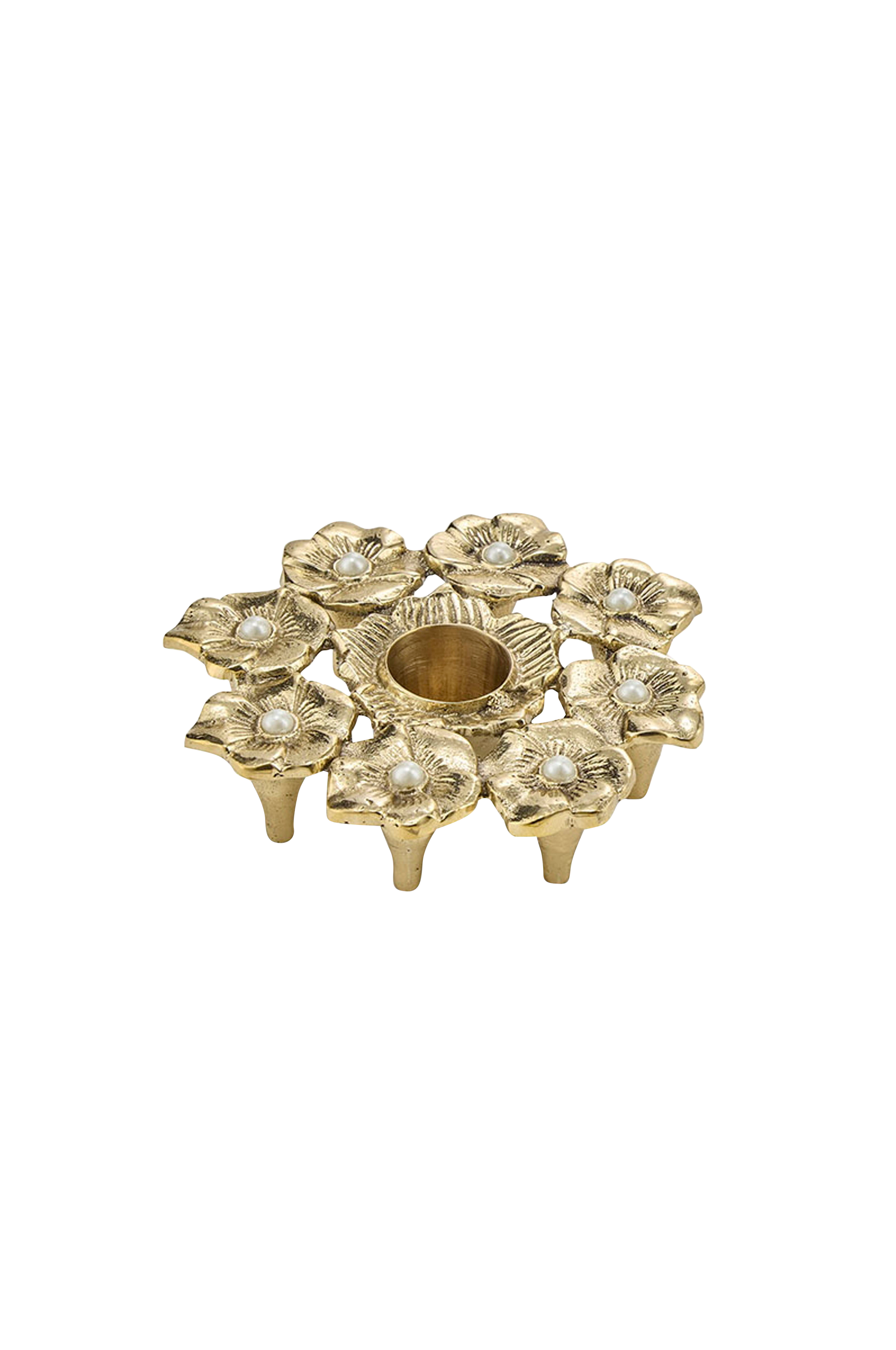 Tilføj et strejf af vintage charme og elegance til dit hjem med Zoey Flower Candle Holder. Dette smukt håndlavede stykke er lavet af massivt messing og formet som en blomstrende buket, hvor hver blomst er delikat prydet med et perlemorsagtigt center. Lysestagen måler 11 x 11 x 2,5 cm og er designet til at rumme et standardlys. Den er et iøjnefaldende blikfang på ethvert bord, hylde eller kaminhylde. Uanset om den bruges som en del af din daglige indretning eller til særlige lejligheder, bringer dens varme gyldne finish og intrikate blomsterdetaljer en hyggelig, romantisk glød til dit rum. Produktdetaljer: