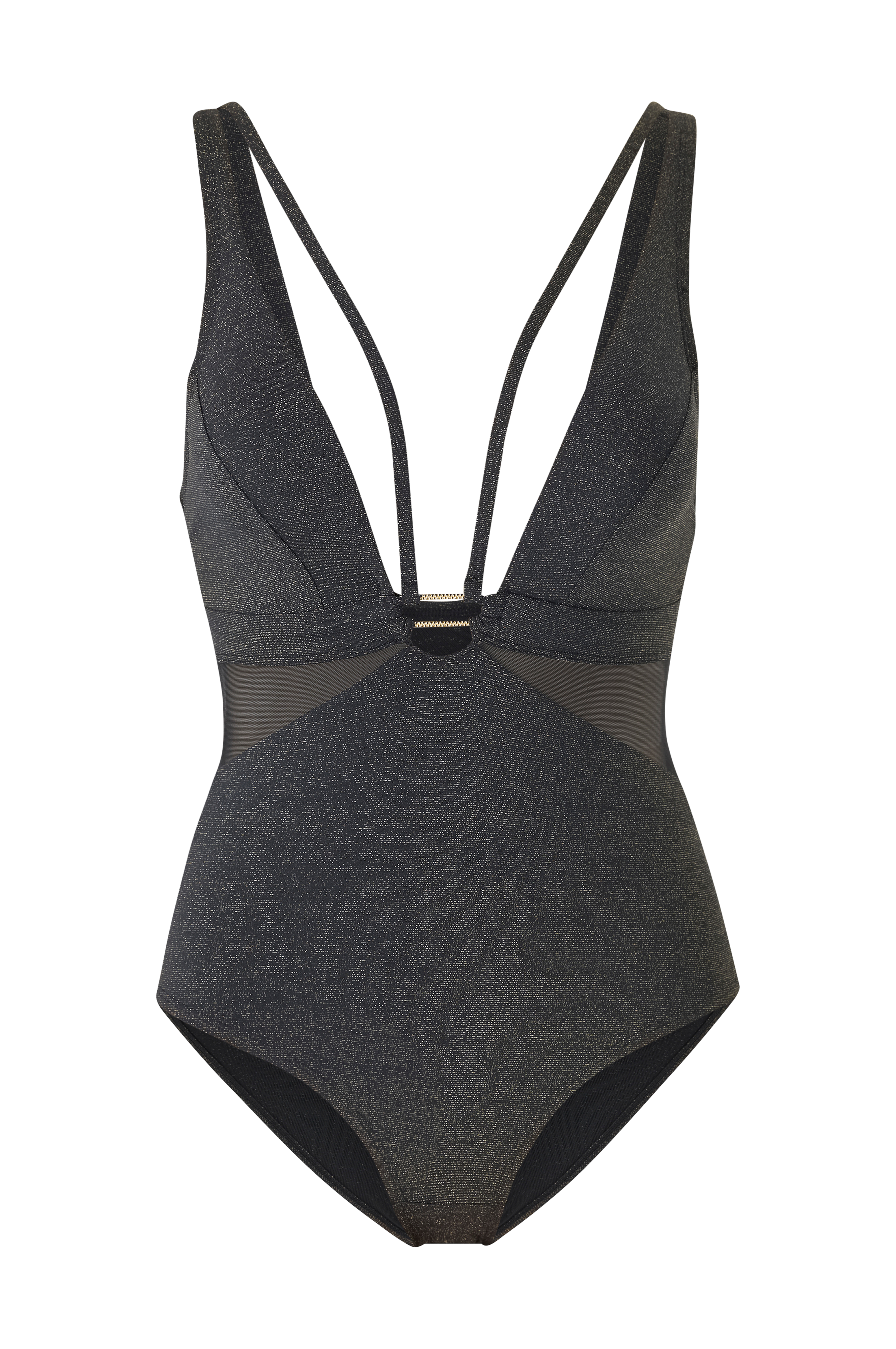 • Guldglitrende model med indlæg i mesh • Detalje i metal midt foran • Formet, aftagelig polstring • Justérbare skulderstropper • Foret skridt • Helt foret