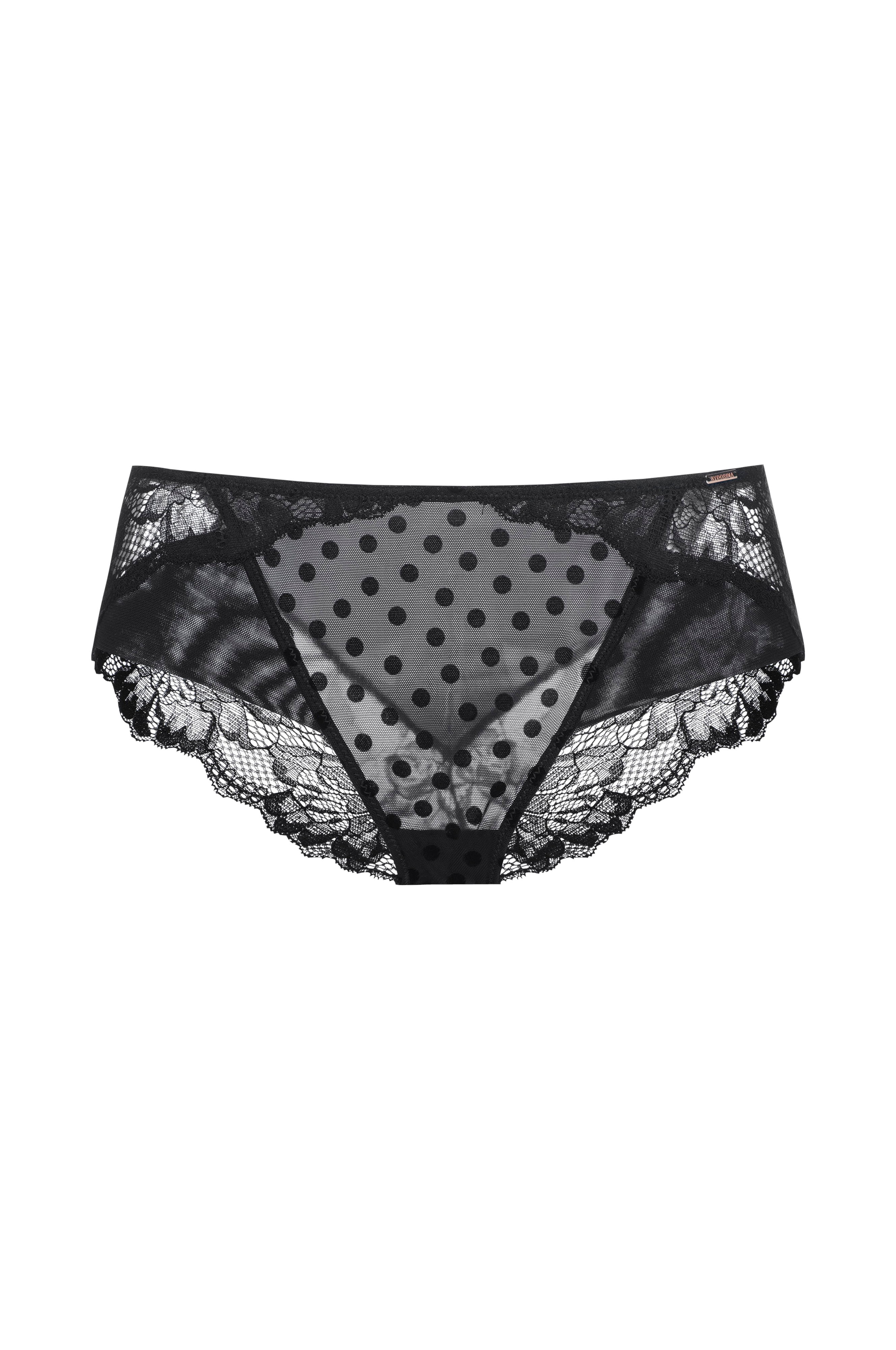 • Hipstertrusse med blonde bagpå og på siderne• Prikket, elastisk, semitransparent stof ved fronten• Elastik ved taljen• Påsyet, lille, rustfarvet mærke oppe foran