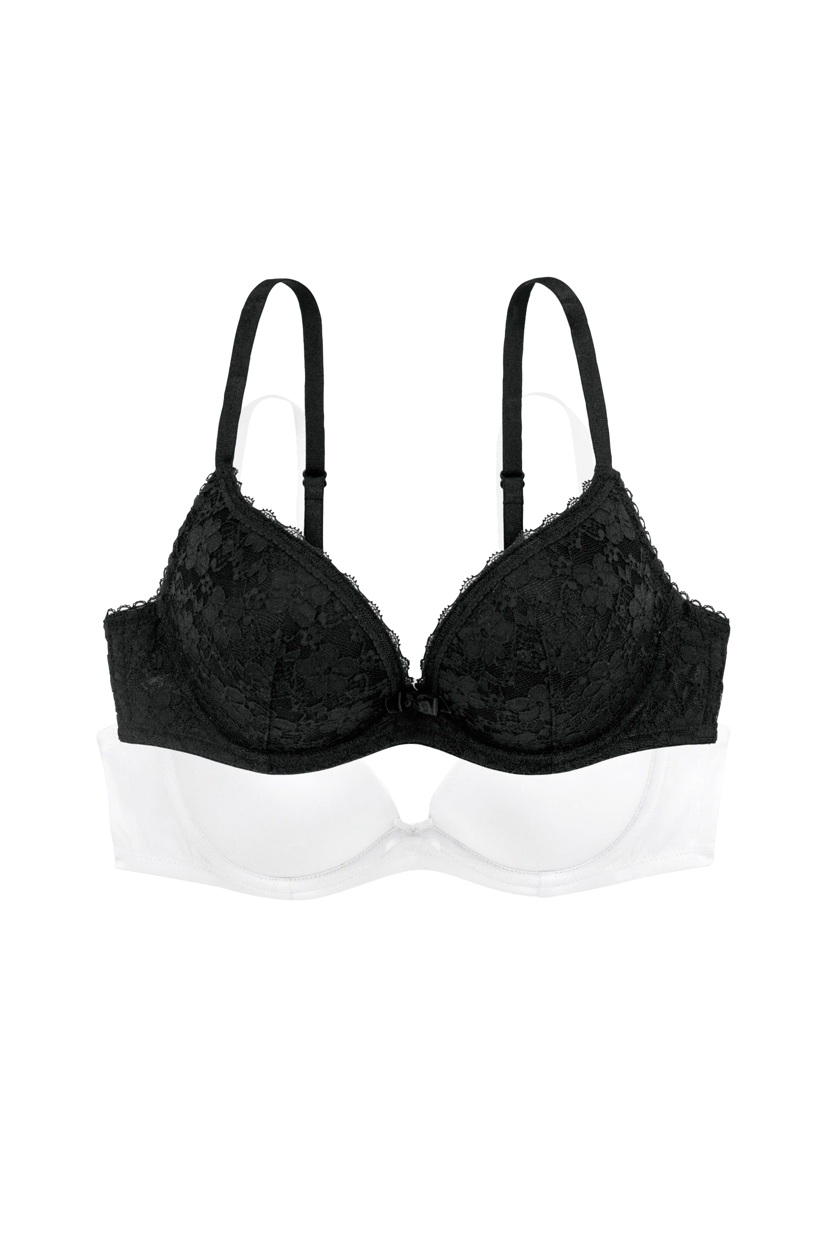 Bøjle-bh med fast push up-vattering for løft og støtte. Sæt med to bh'er, en med blondeskåle og en med glatte skåle. Justerbare skulderstropper og hægte- og mallelukning bagpå.