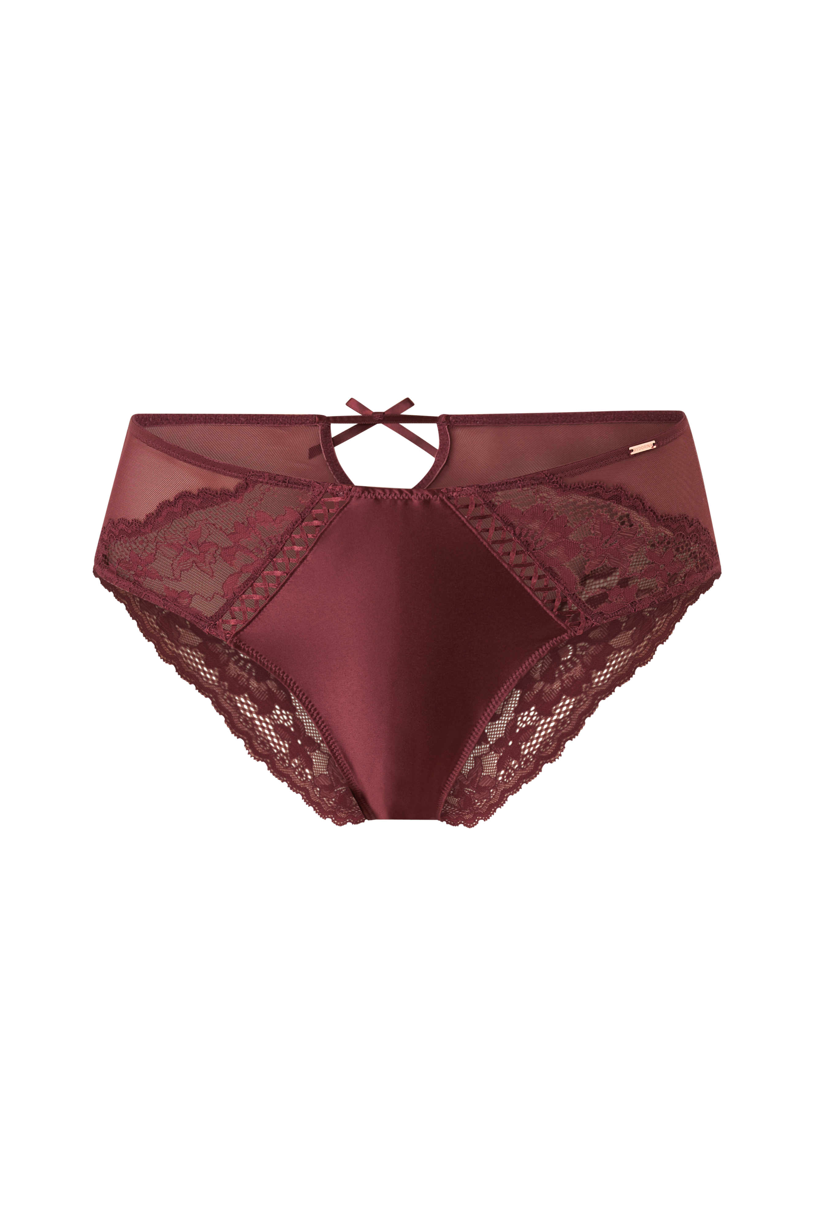 • Trusser i blonde med satinstof foran og mesh bagpå• Dekorativ v-udskæring med bånd bagpå• Foret skridt