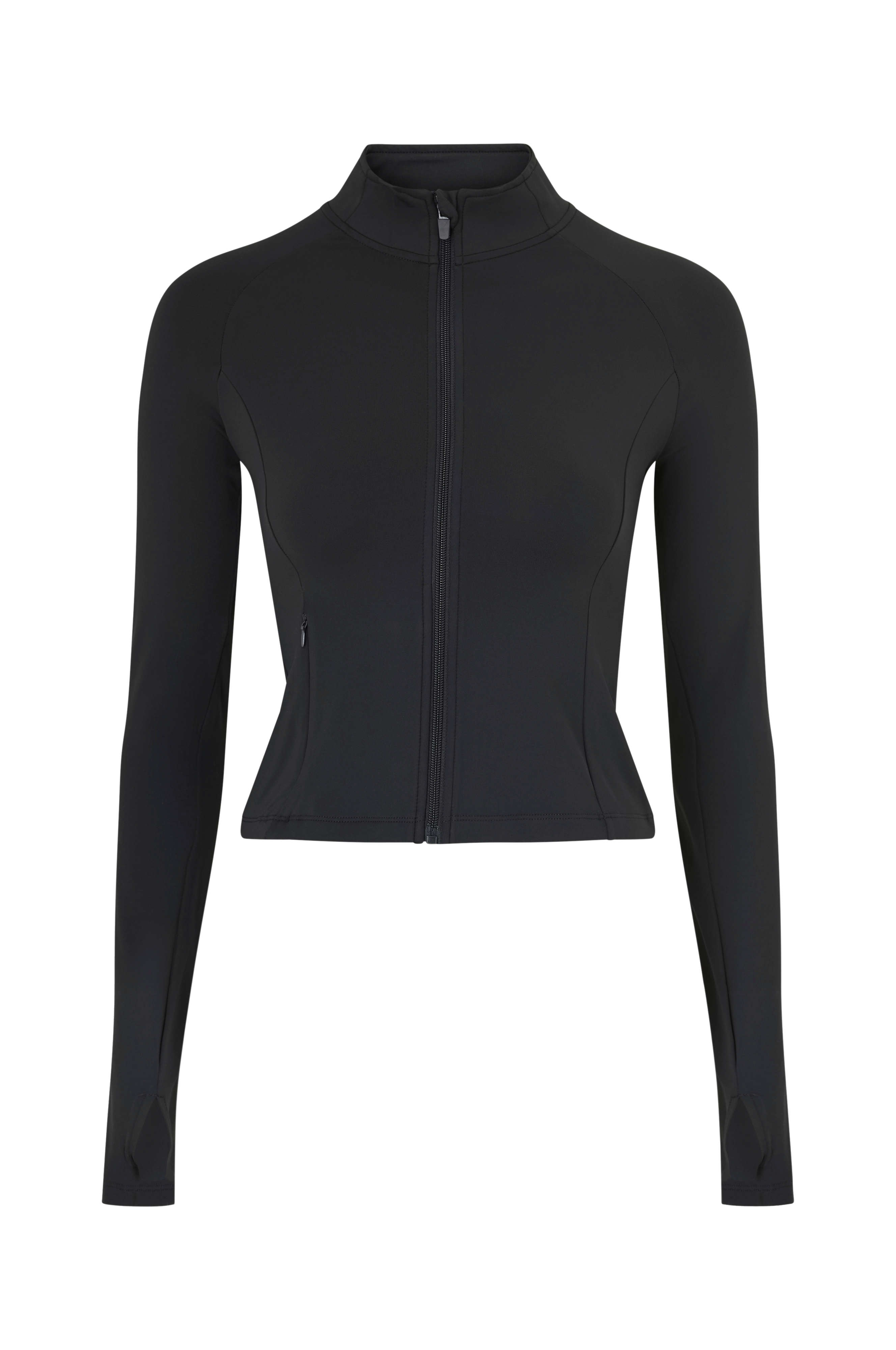 • Langærmet, figursyet træningstrøje med opretstående krave• Lynlås med hagebeskytter• Lynlåslomme i den ene side• Tommelfingerhul ved manchetterne