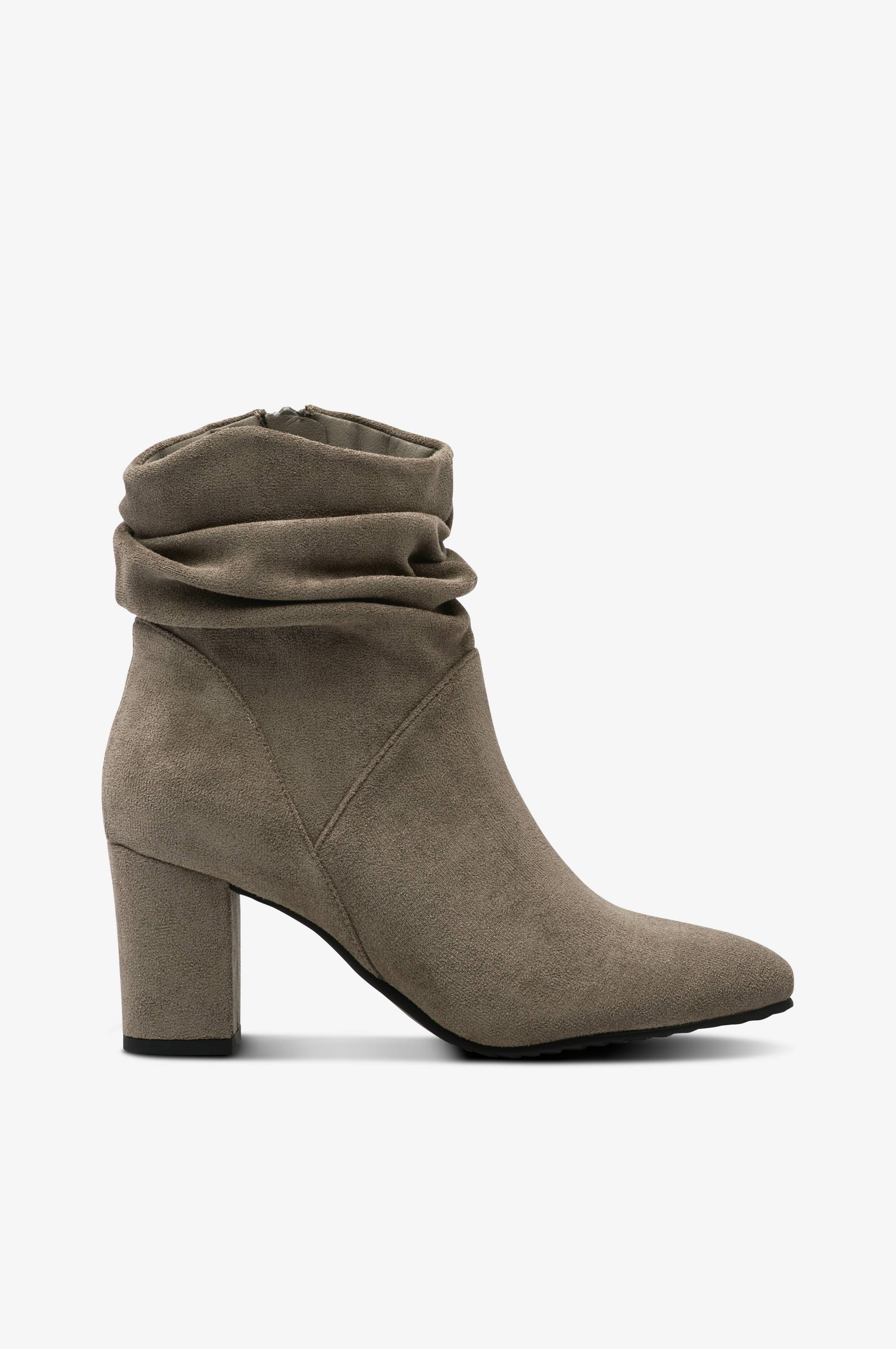 • Boots i ruskindsmateriale• Rynket skaft med lynlås• Spids snude• Beklædt hæl• Skafthøjde: 14 cm i str. 37• Hælhøjde: 7 cm