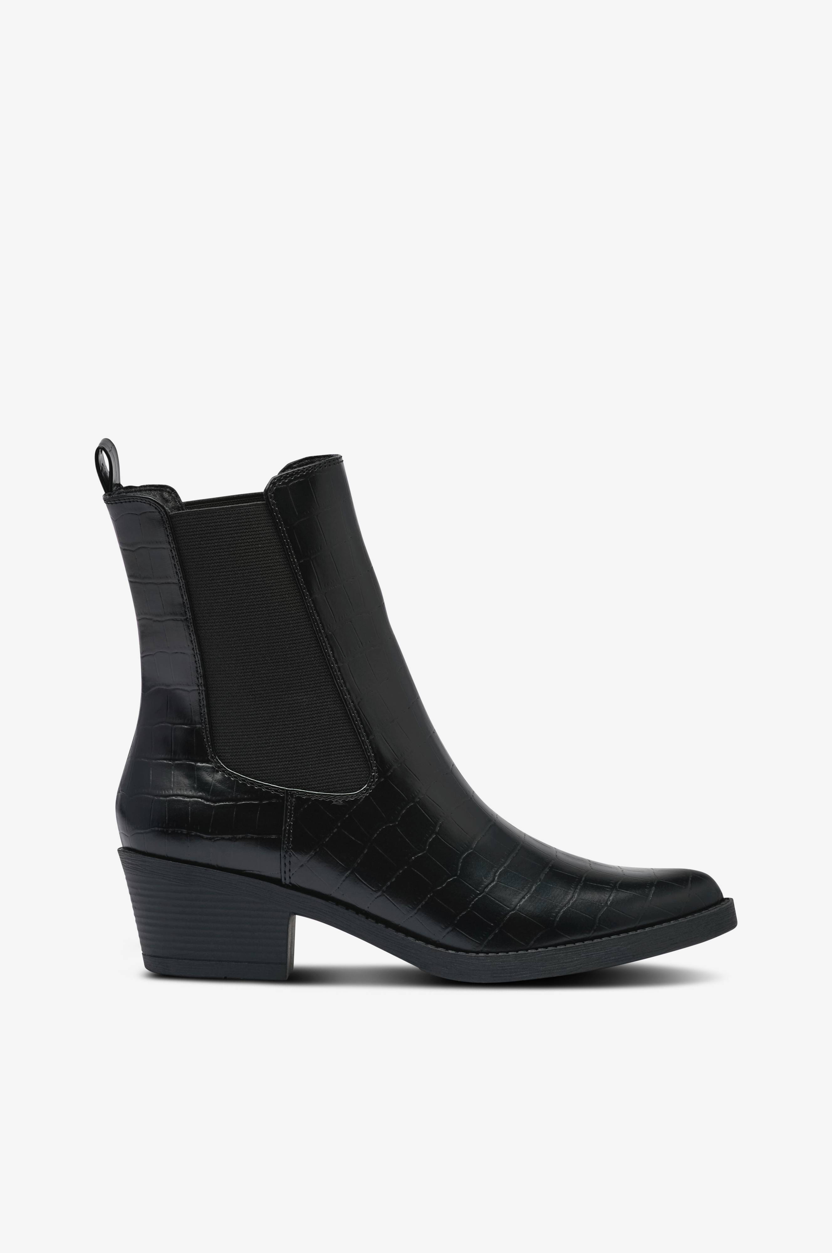 • Boots i kunstigt slangeskind• Spids tåform• Elastiske paneler på begge sider af skaftet• Trækstrop bagpå• Tekstilforing• Skafthøjde: 15 cm i str. 37• Hælhøjde: 5 cm