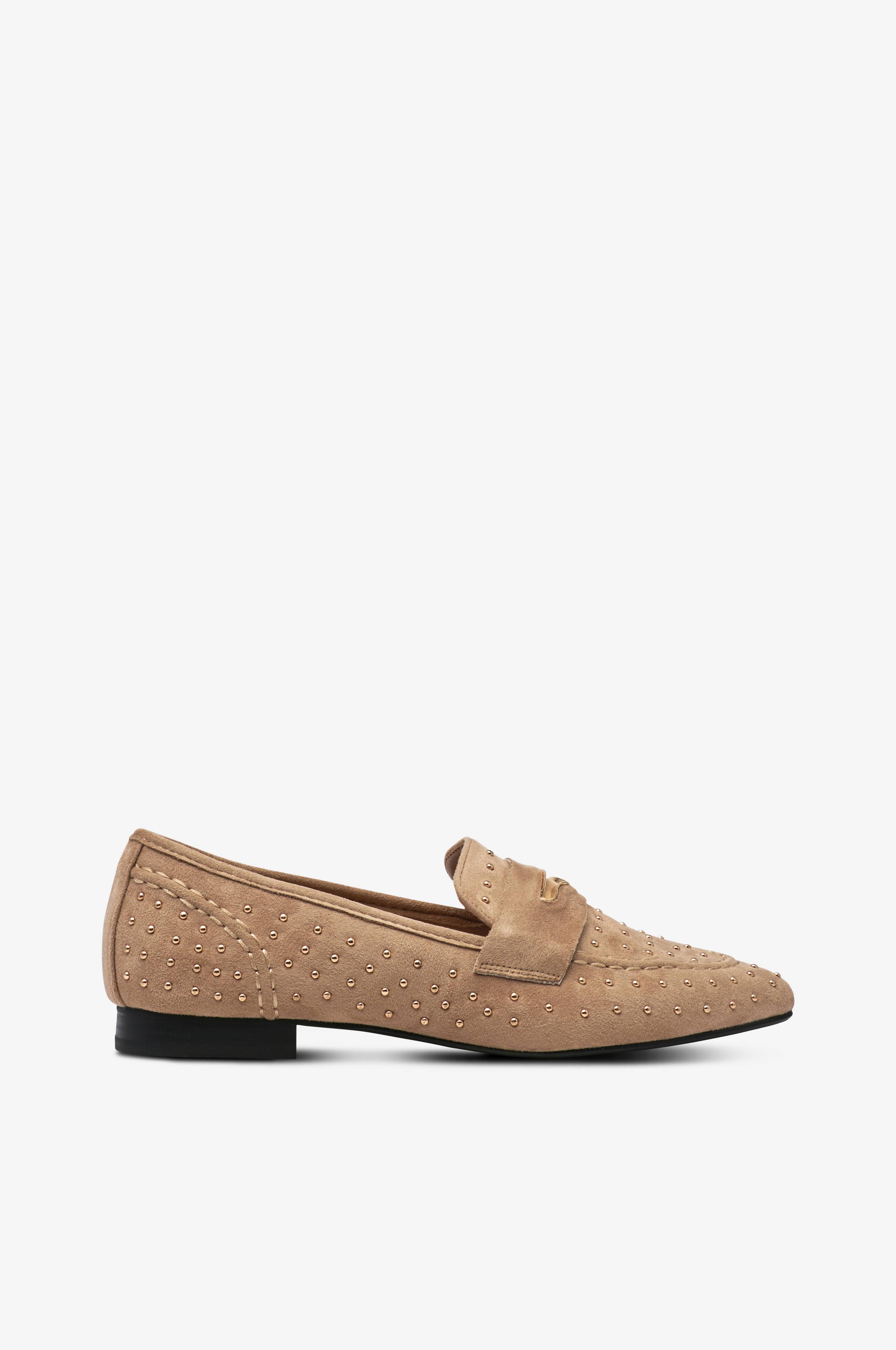 • Sko i ruskind med spids tåform• Dekorative, guldfarvede nitter hele vejen rundt• Rem over foden med detalje i guldfarvet metal• Tekstilforing• Ydersål i gummi